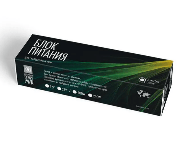 Блоки питания для светодиодных лент предназначены для корректного питания светодиодных лент, так же они обеспечивают защиту от перегрузки и короткого замыкания. Блок питания выбирается, исходя из общей мощности светодиодной ленты + 10% запаса. Компактный блок питания мощностью 240 W.
