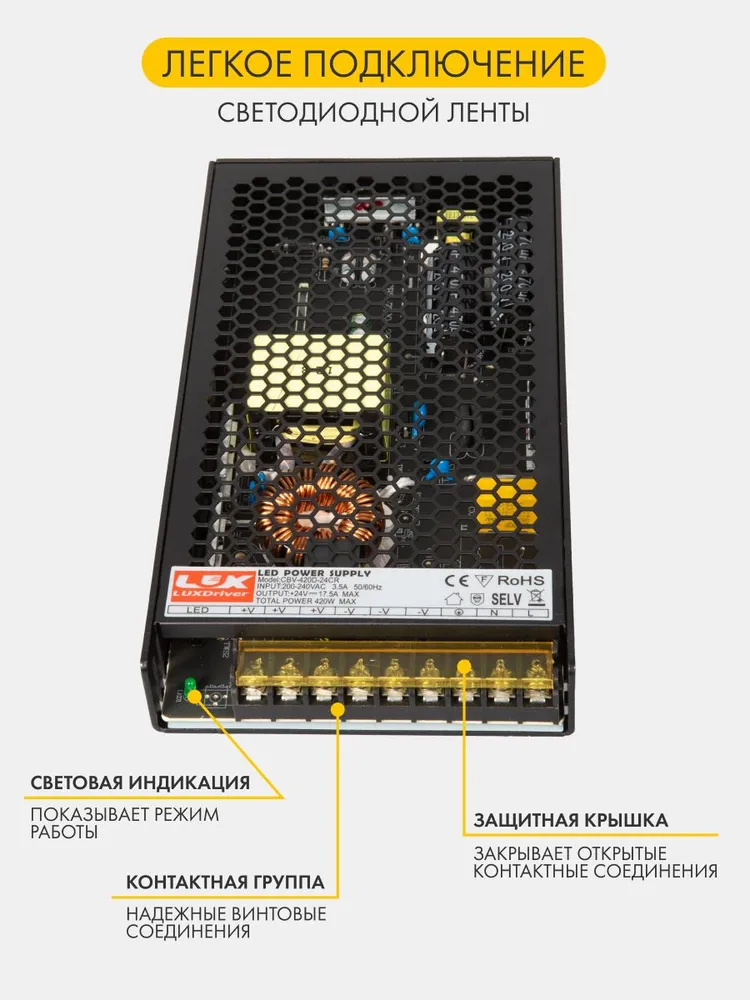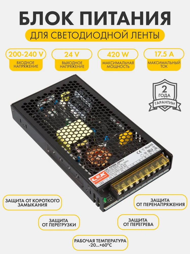 Блок питания для светодиодной ленты LUXDriver, 24В, 420Вт, 17.5А, IP20.