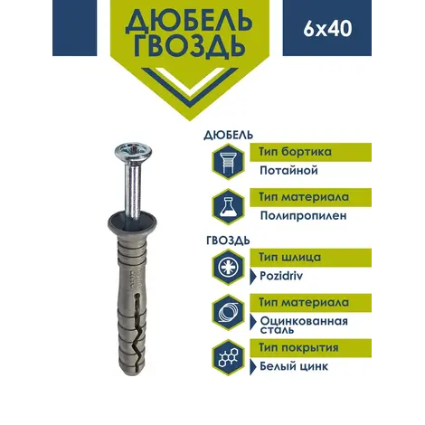 Дюбель-гвоздь Daxmer потай., 6x40, 200 шт. используется для монтажа нетяжелых предметов интерьера, конструкционных элементов и аксессуаров. Применяется в процессе установки оконных и дверных (межкомнатных) блоков, карнизов, кабель-каналов, профиля, легких полок и креплений к основаниям из кирпича, монолита или других полнотелых материалов. Для установки необходимо предварительно просверлить отверстие. Прочность крепежа достигается расклиниванием дюбеля в отверстии гвоздем в момент удара молотком. Гвоздь оснащён винтовой нарезкой и крестообразным шлицем, благодаря чему может осуществляться оперативный демонтаж крепежа. Дюбель-гвоздь с потайным бортиком устанавливается «заподлицо», т.е. его шляпка утапливается, благодаря чему возможно производить крепежные работы без последующего выравнивания поверхности.