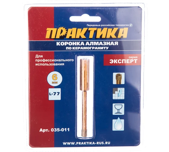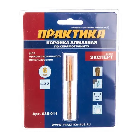 Коронка алмазная по керамограниту 6мм серия эксперт, блистер Практика на дрель