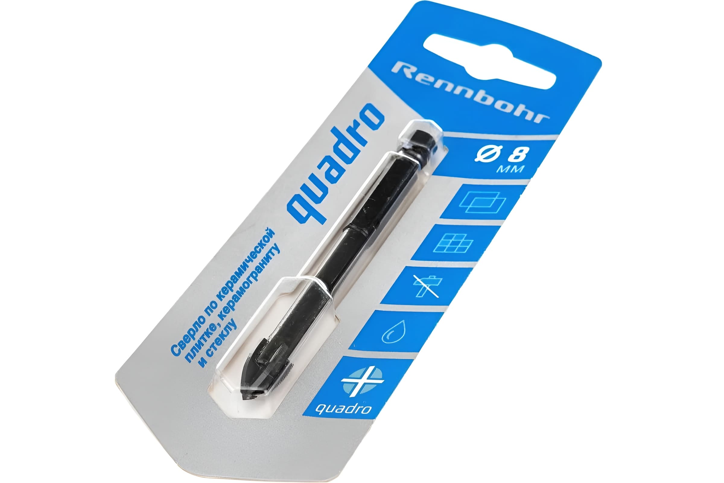 Сверло по керамике Quadro 8 мм RENNBOHR 676108 применяется для сверления отверстий в керамической плитке 1-4 класса твёрдости, керамограните, стекле.
