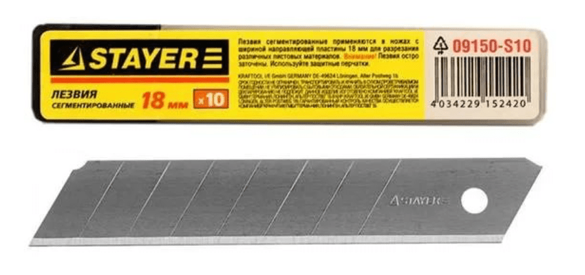 Сегментированные лезвия STAYER 18 мм 10 шт. 09150-S10 Лезвия предназначены для реза различных материалов Для сохранения инструмента в рабочем состоянии, а так же предусмотренной гарантией завода изготовителя, наш интернет-магазин (zubr36) рекомендует использовать Сегментированные лезвия STAYER 18 мм 10 шт. 09150-S10 строго по назначению.