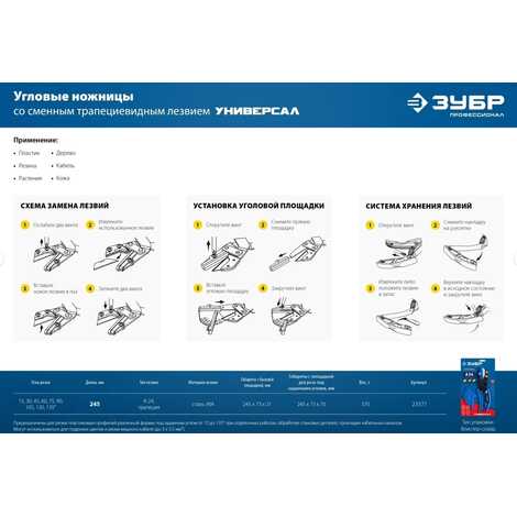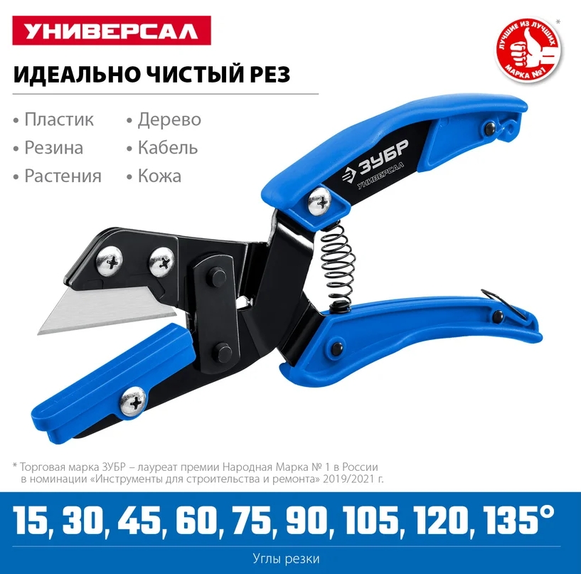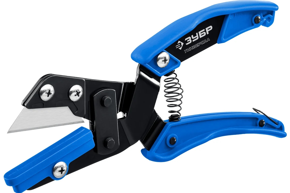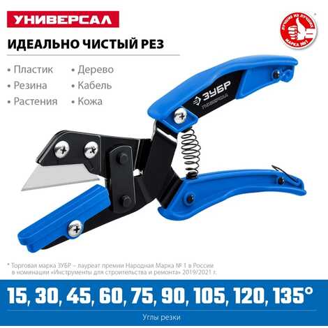 Угловые ножницы ЗУБР Универсал представляет собой универсальный инструмент для чистого реза со сменным лезвием. Идеально справляется с резкой различных профилей из резины и пластика. Ножницы способны резать даже медный кабель сечением до 3х5,5 мм². Сменная площадка для резки под различными углами в комплекте.