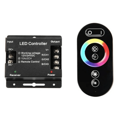 Сенсорный контроллер RGB для LED ленты с пультом EL-T3-RGB-30A предназначен для управления светодиодной продукцией, работающей от напряжения 5-24В DC. Регулирует цвет, яркость свечения и создает различные динамические эффекты.