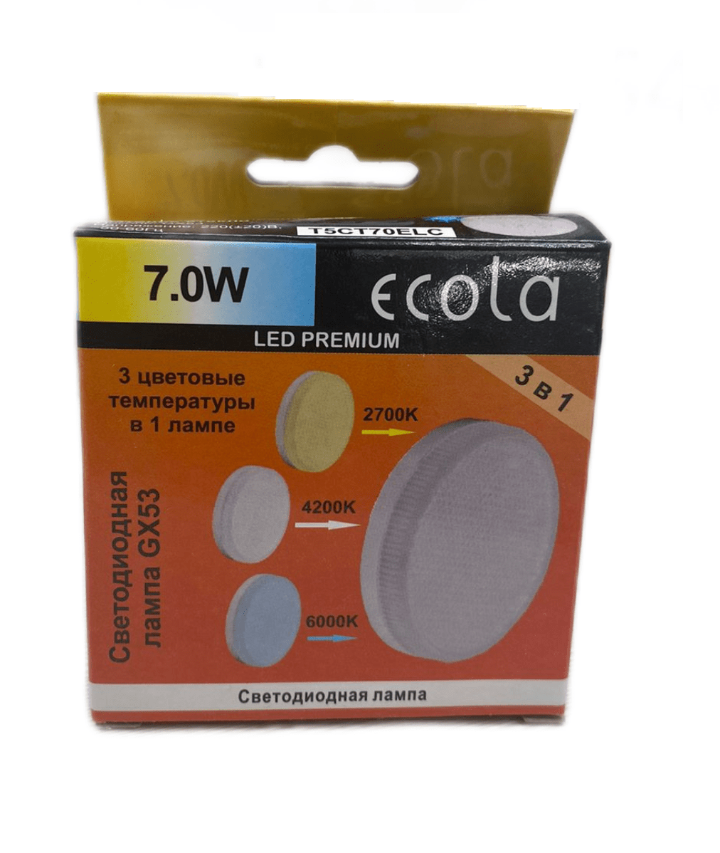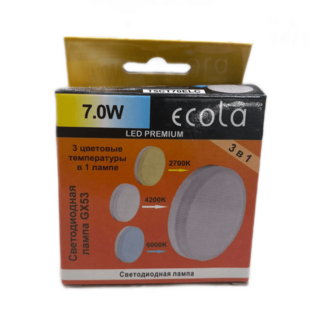 3 в 1-ом LED лампа Ecola premium с матовым рассеивателем для светильников GX53, мощностью 7W, работает в 3-х цветовых режимах: теплый свет, нейтральный белый свет и холодный свет. Переключение режимов производится через включение - выключение лампы. Лампы Ecola premium оснащены качественным драйвером со стабилизатором и сглаживающим фильтром, убирающим пульсацию. Обладают повышенными характеристиками. Все лампы проходят предпродажное тестирование на фабрике ECOLA.