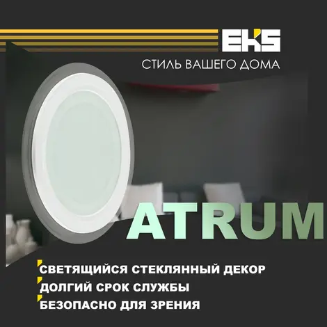Встраиваемый светодиодный светильник EKS ATRUM для основного, декоративного и акцентного интерьерного освещения. Универсальная LED панель подходит для натяжного потолка и любых подвесных конструкций. Светодиодная панель имеет равномерный яркий свет без пульсаций и мерцания. Не утомляет и не раздражает глаза. Утонченный вид прибору придает стеклянный декор с подсветкой, который при включении образует светящийся ореол.