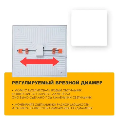 Потолочные светильники этой серии оснащены регулируемым врезным диаметром, благодаря чему можно настроить и отрегулировать крепления под нужное Вам отверстие для установки, что значительно облегчает монтаж светильника. Также возможно встраивание более мощного светильника в отверстие от менее мощного и использование одинаковых комплектующих для светильников разной мощности.