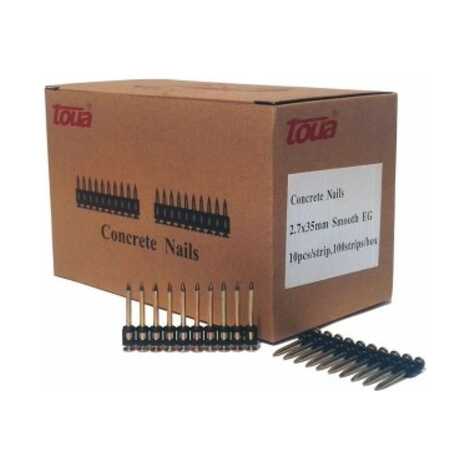 Дюбель-гвозди по бетону , металлу, кирпичу TOUA 2735smoothEG подходят для большинства газовых и пневматических монтажных пистолетов, широко используются в общестроительном монтаже: монтаж фанеры к бетону, монтаж тонких металлических и алюминиевых направляющих к бетону и кирпичу, монтаж профлиста к бетону, кирпичу и к немассивному стальному основанию толщиной до 4-5 мм. Так же применяются для пристрелки направляющих ГКЛ, штукатурной сетки и инженерных систем.
