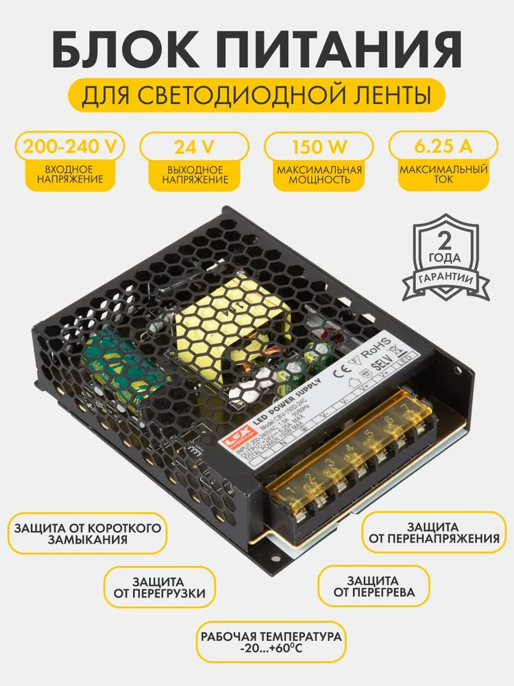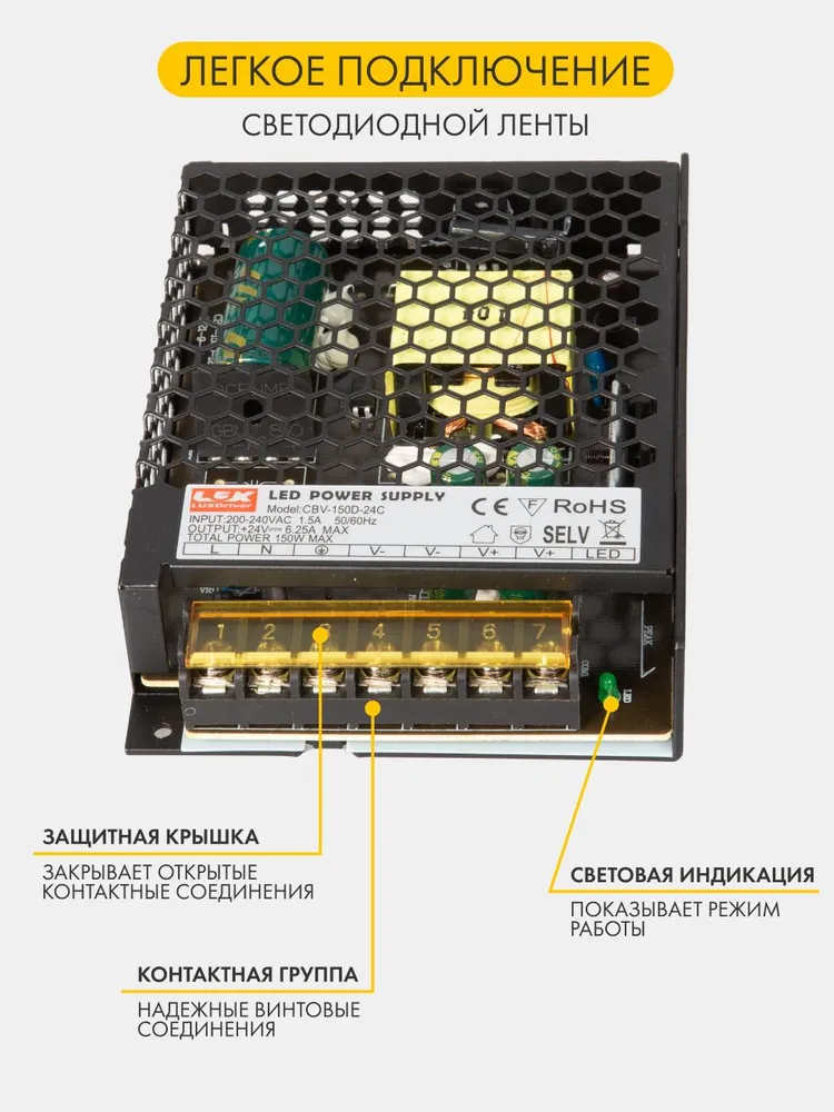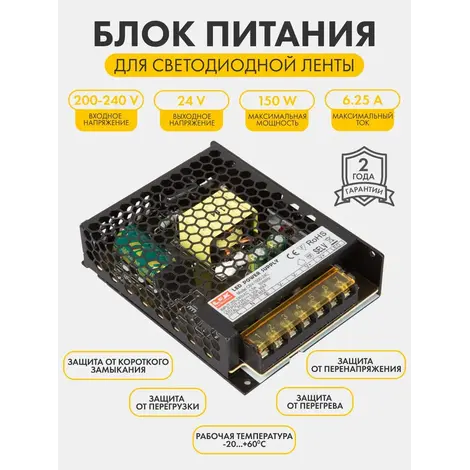Блок питания для светодиодной ленты LUXDriver, 24В, 150Вт, 6.3А, IP20.