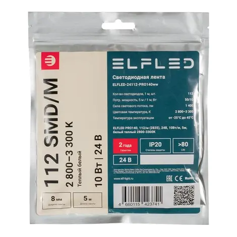 Лента светодиодная ELFLED PRO140, 10Вт/м, 24В, тепл., 2800-3300К, 112д/м, 5м