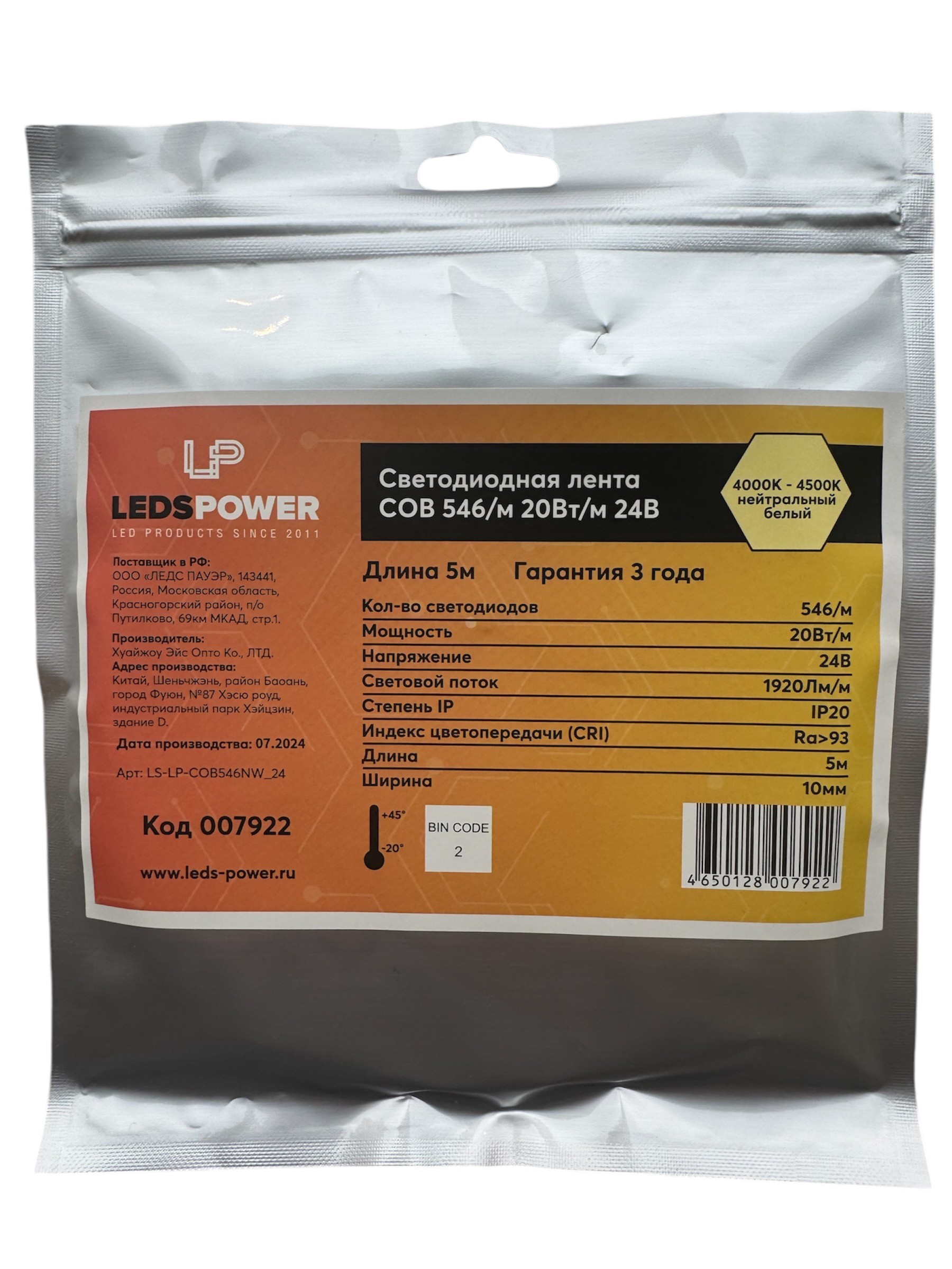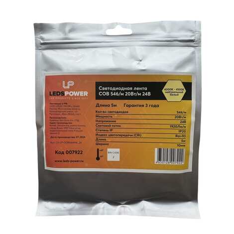 Светодиодная лента LEDS POWER (серия COB), 5м, 24В, IP20, 546 LED/m, нейтральный белый.