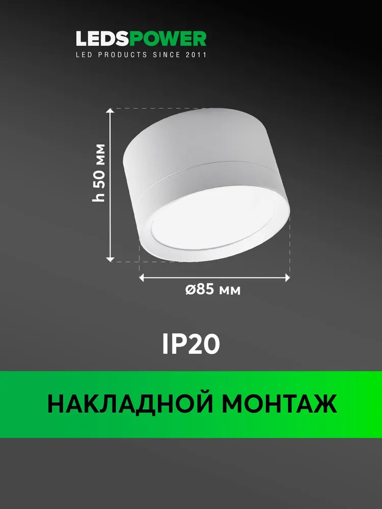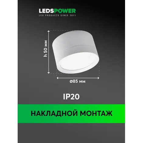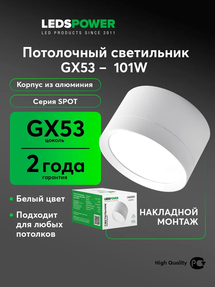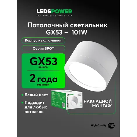 Накладной светильник GX53-101W, серия SPOT GX53 белый матовый. Рекомендуется использовать с лампами LEDS POWER. Подходит для любых типов потолков, в том числе натяжных и гипсокартоновых. Цоколь GX53, монтажное отверстие 90мм.