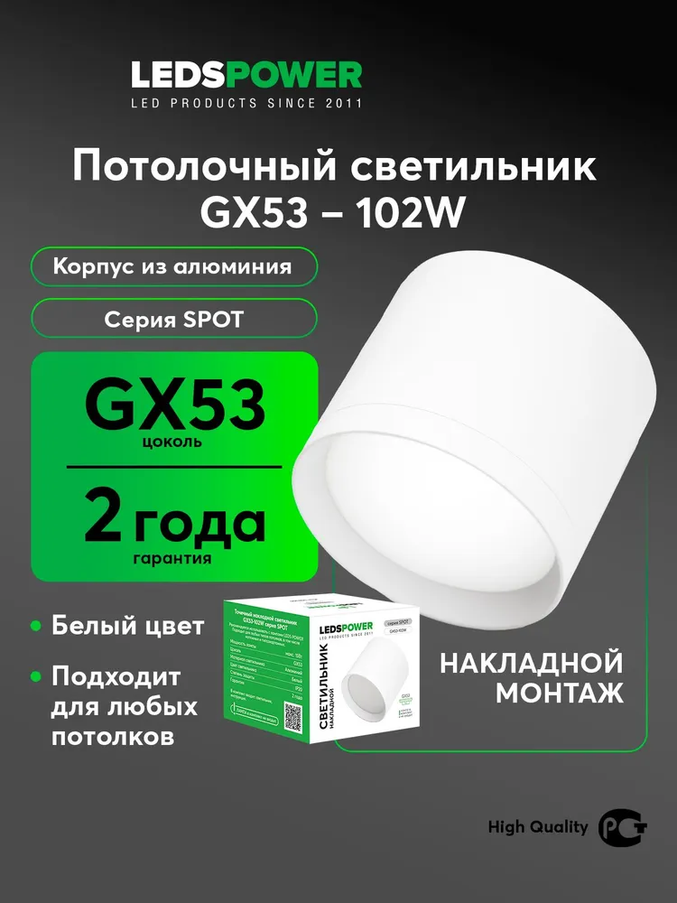Накладной светильник GX53-102W, серия SPOT GX53 белый матовый. Рекомендуется использовать с лампами LEDS POWER. Подходит для любых типов потолков, в том числе натяжных и гипсокартоновых. Цоколь GX53, монтажное отверстие 90мм.