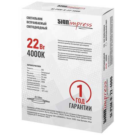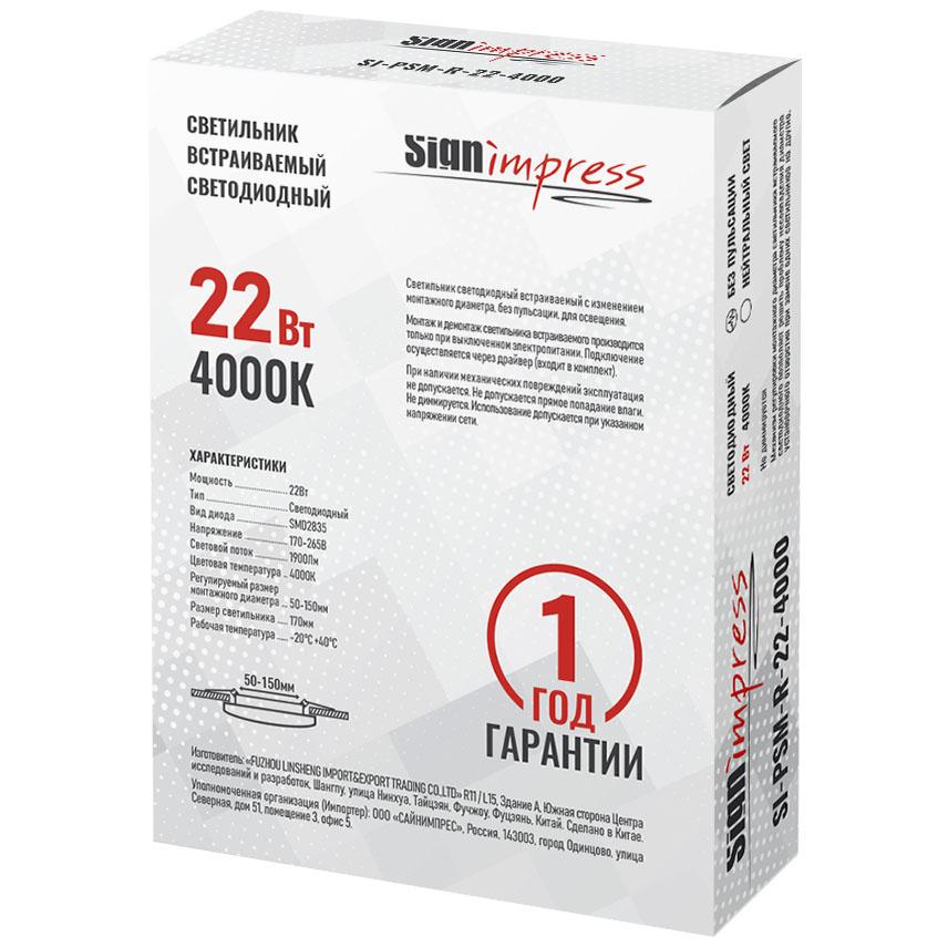 Светильник светодиодный регулируемый (до 150мм) 22Вт 4000K 1900Лм SI-PSM-R-22-4000 SignImpress. Механизм регулировки монтажного диаметра позволяет решить проблему несовпадения диаметра установочного отверстия при замене одних светильников на другие. Светильник встраиваемый не содержат ртутьсодержащих веществ, поэтому он не представляет опасности в случае выхода из строя или разрушения.