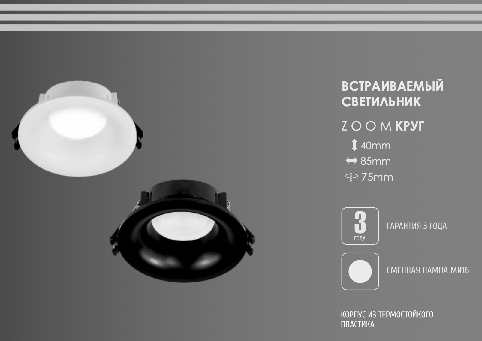 Встраиваемый светильник MR16, ZOOM круг идеально впишется в любой современный интерьер. Благодаря своему корпусу из термостойкого пластика и качественному покрытию — светильник выглядит эстетично и порадует глаз любому дизайнеру интерьеров.