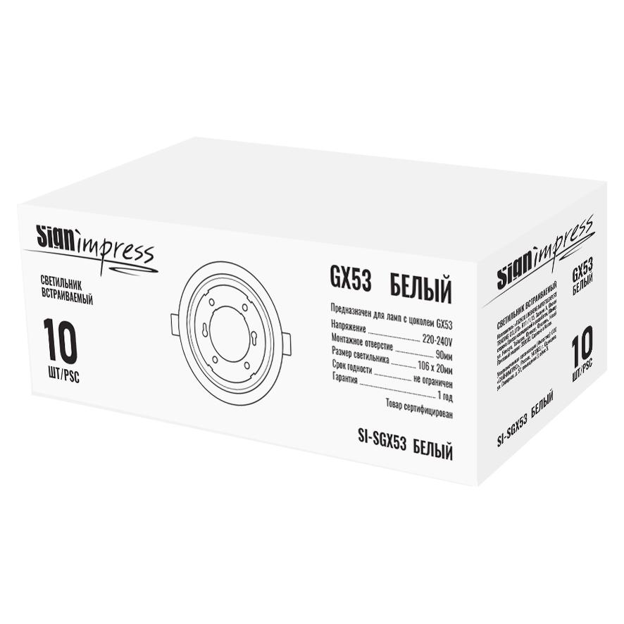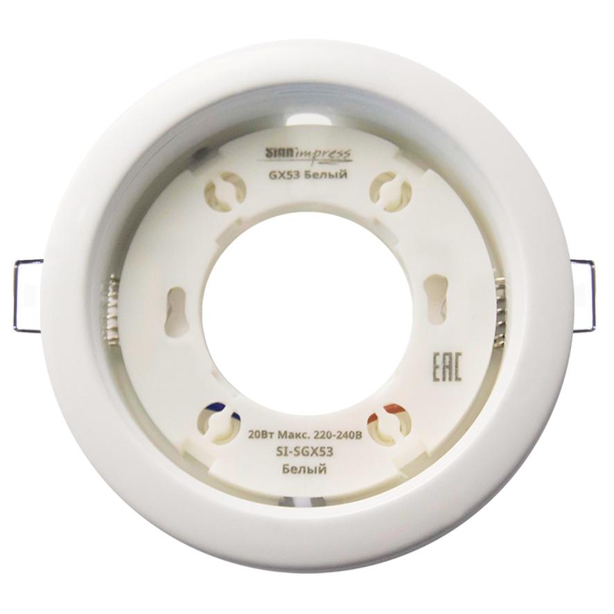 Светильник встраиваемый GX53 Белый SignImpress с плоским патроном (который производится из материалов диэлектриков) оснащенным двумя прорезями и контактами для штырьков лампы, которые вводят в патрон и проворачивают до упора. Металлический корпус с защитно-декоративным покрытием из качественных материалов. Провод по ГОСТ, без занижения сечения. Продуманная конструкция патрона, позволяет использовать лампы с отклонениями от размеров и обеспечивает замену лампы без проблем и надежный эл. контакт. Пружинные лапы оптимальны и удобны в монтаже и демонтаже, исключено повреждение потолка. Cветильник предназначен для освещения административных, офисных и жилых помещений. Рассчитан для работы с лампами цоколя GX53. Так же устанавливается совместно с протекторным кольцом.