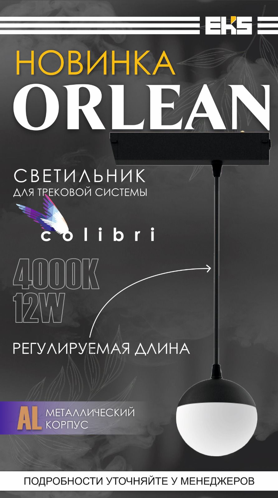 Трековый светильник COLIBRI ORLEAN 12 Вт, 4000K, 900ЛМ (черный) от компании EKS для трековых систем S25. Подвесной светильник шарообразной формы, шнур длиной 120см можно регулировать на необходимую высоту.