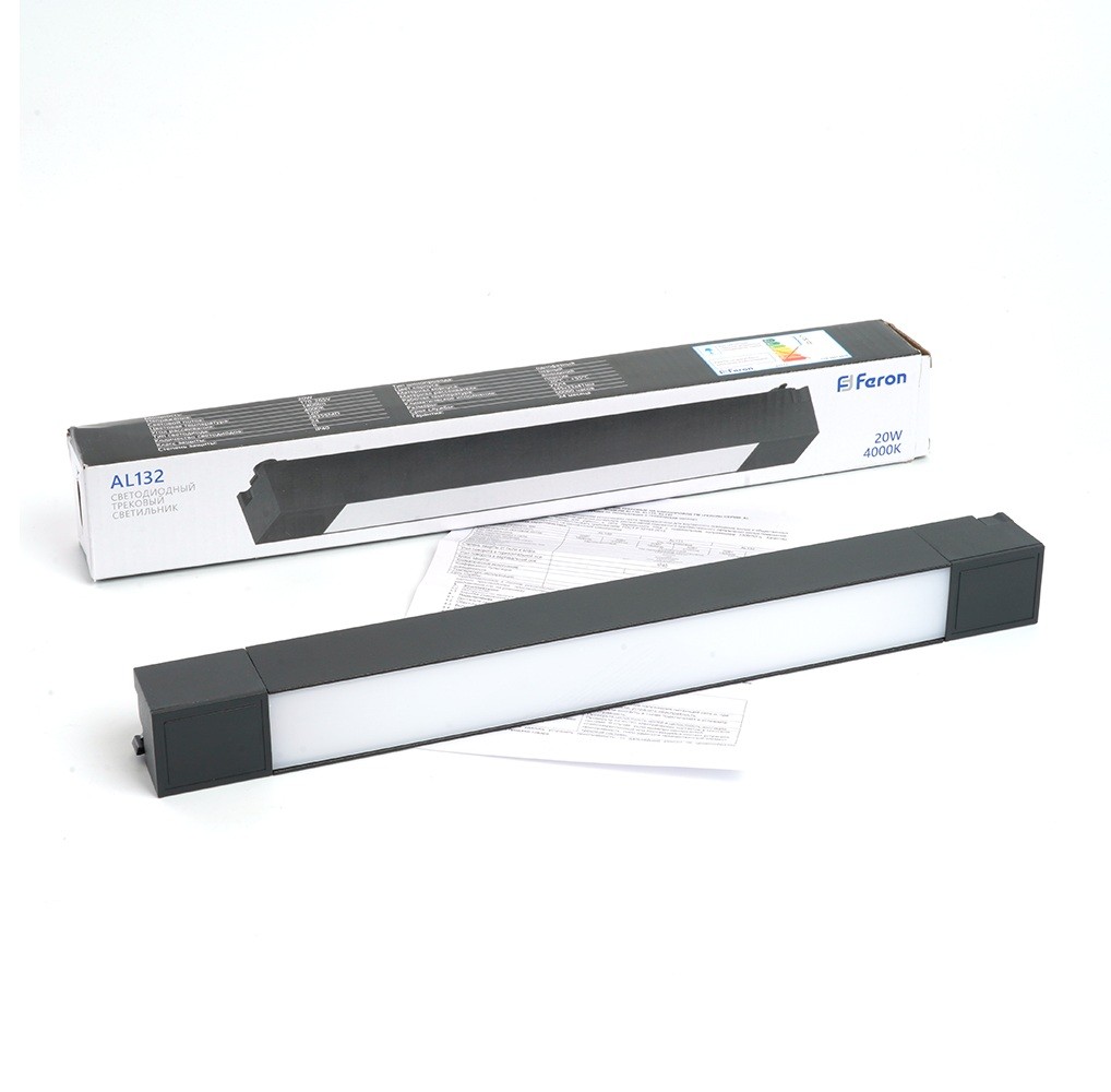 Трековый светильник поставляется в брендовой упаковке Feron в комплекте с паспортом изделия.