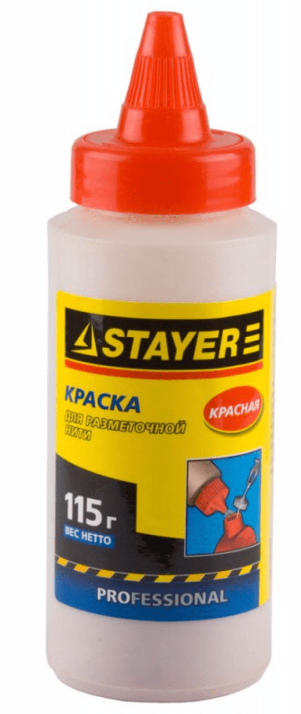 Широкое применение в ремонтных, отделочных, строительных работах находит разметочный шнур. С его помощью очень просто и легко «отбить» идеально ровную горизонтальную, диагональную, вертикальную линию. Достаточно натянуть шнур между двумя ранее поставленными отметками, слегка отвести и отпустить. В месте его соприкосновения с поверхностью останется ярко выраженный след (линия). Однако при условии интенсивного применения, красящая способность инструмента постепенно утрачивается. Получаемая разметка теряет былую четкость, становится блеклой и слабозаметной. В этом случае необходимо заправить разметочную нить, используя меловой порошок (115 г) красный STAYER .Он представляет собой специальный красящий состав, изготовленный на меловой основе.