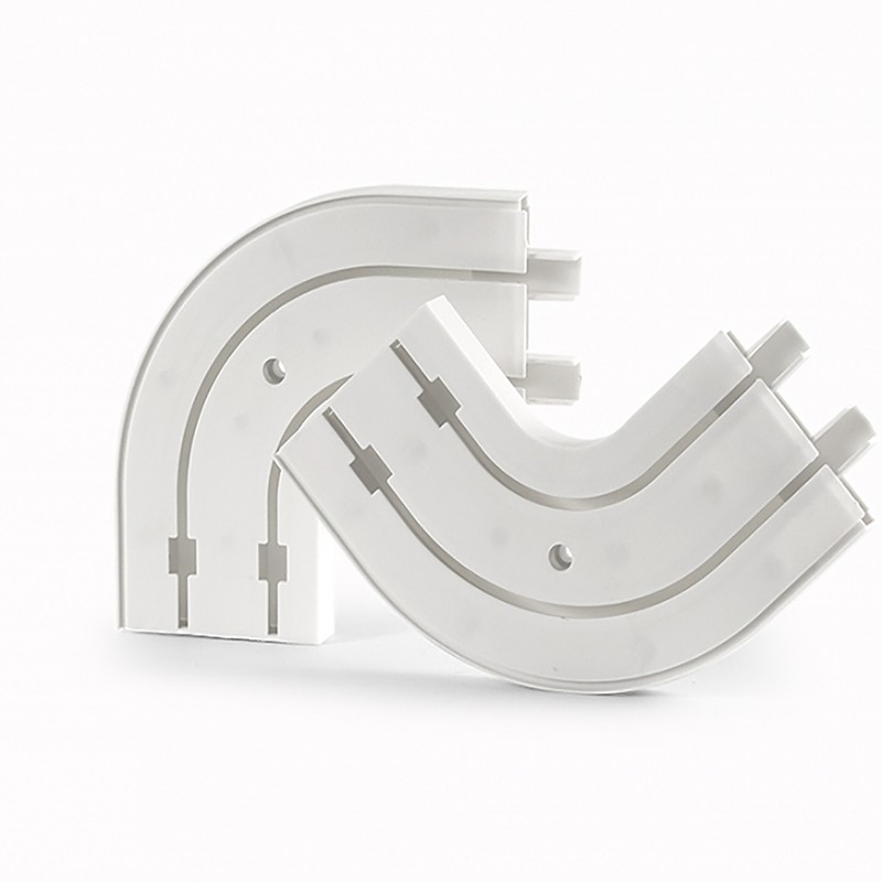 Повороты изготовлены из прочного белого пластика. Они устанавливаются по краям потолочной шины. Благодаря поворотам, шина приобретает эстетически завершенный вид.