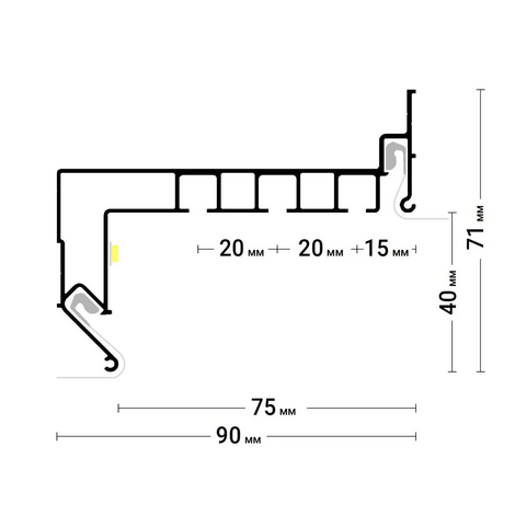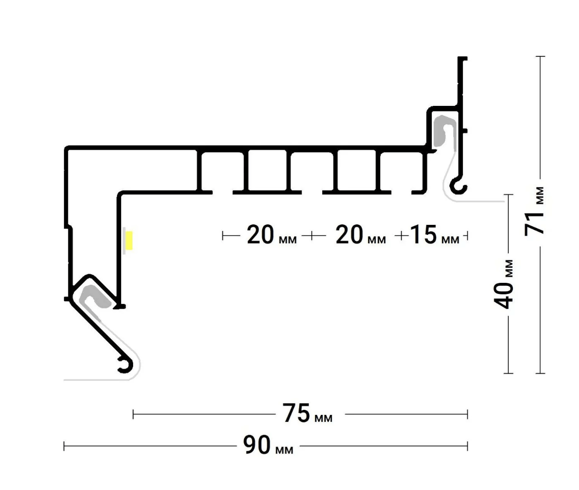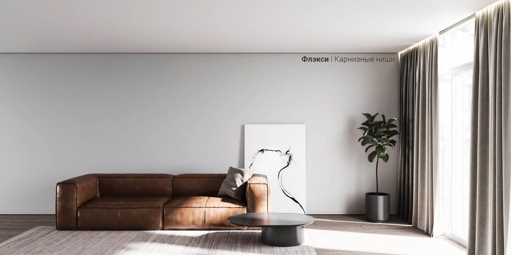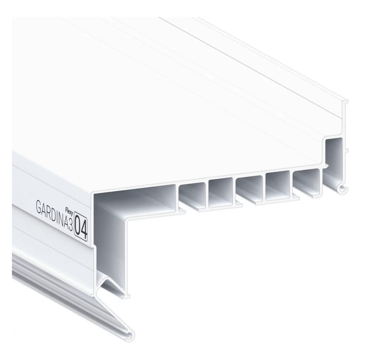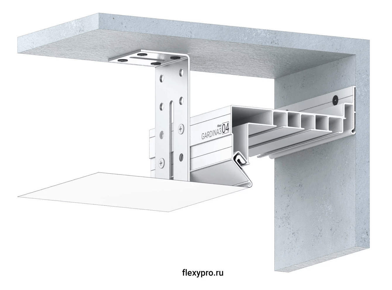 Профиль Flexy GARDINA3 04 для изготовления скрытых карнизных ниш с тремя пазами для установки штор и гардин. Для гарпунной системы крепления полотна с нижней заправкой.