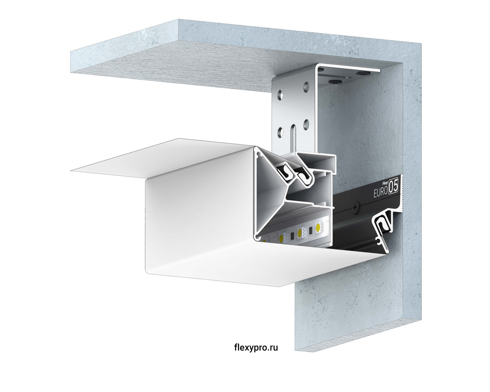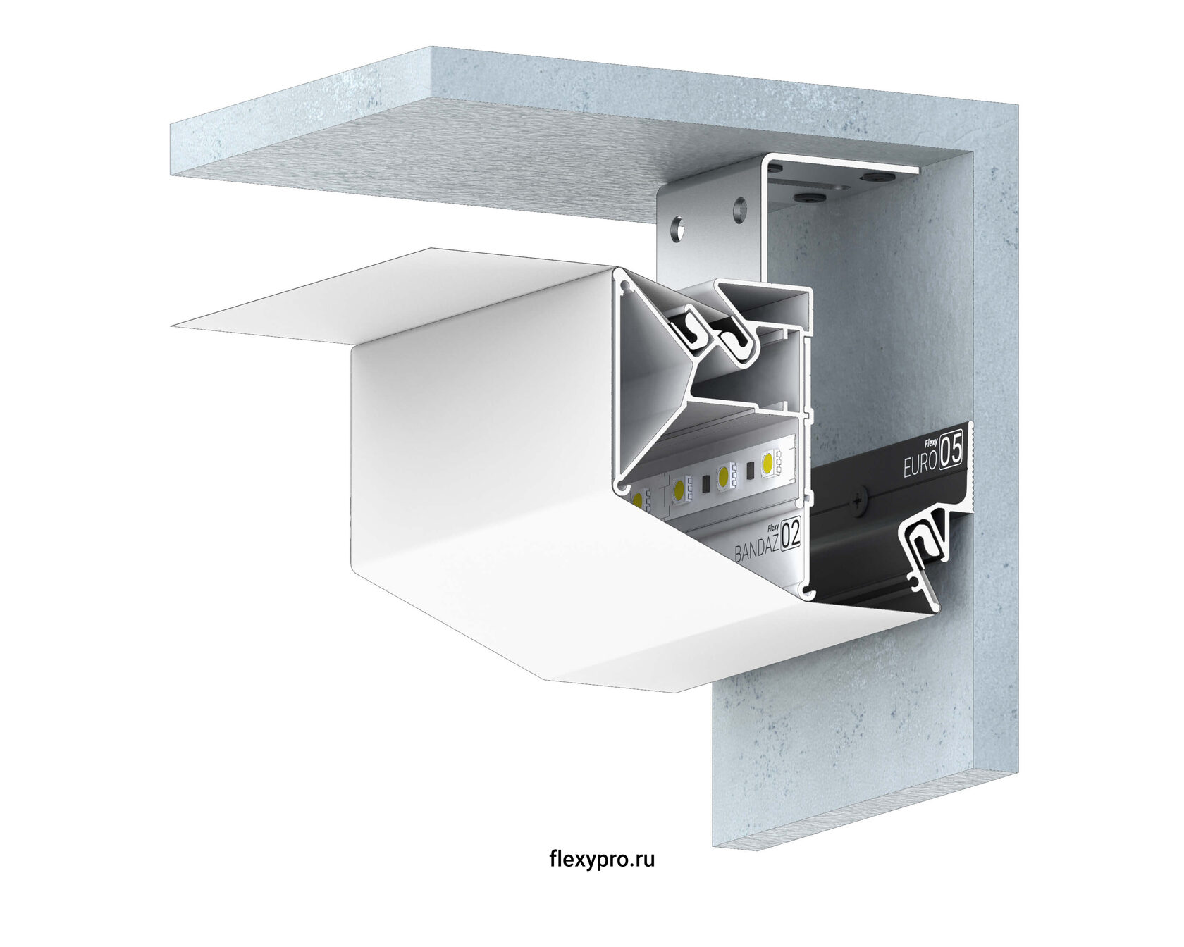 НАПИЛЕННЫЙ профиль Flexy FUSION 02 для криволинейных многоуровневых натяжных потолков с гарпунной системой крепления полотна. С бесщелевым примыканием полотен. С полкой для светодиодной ленты.