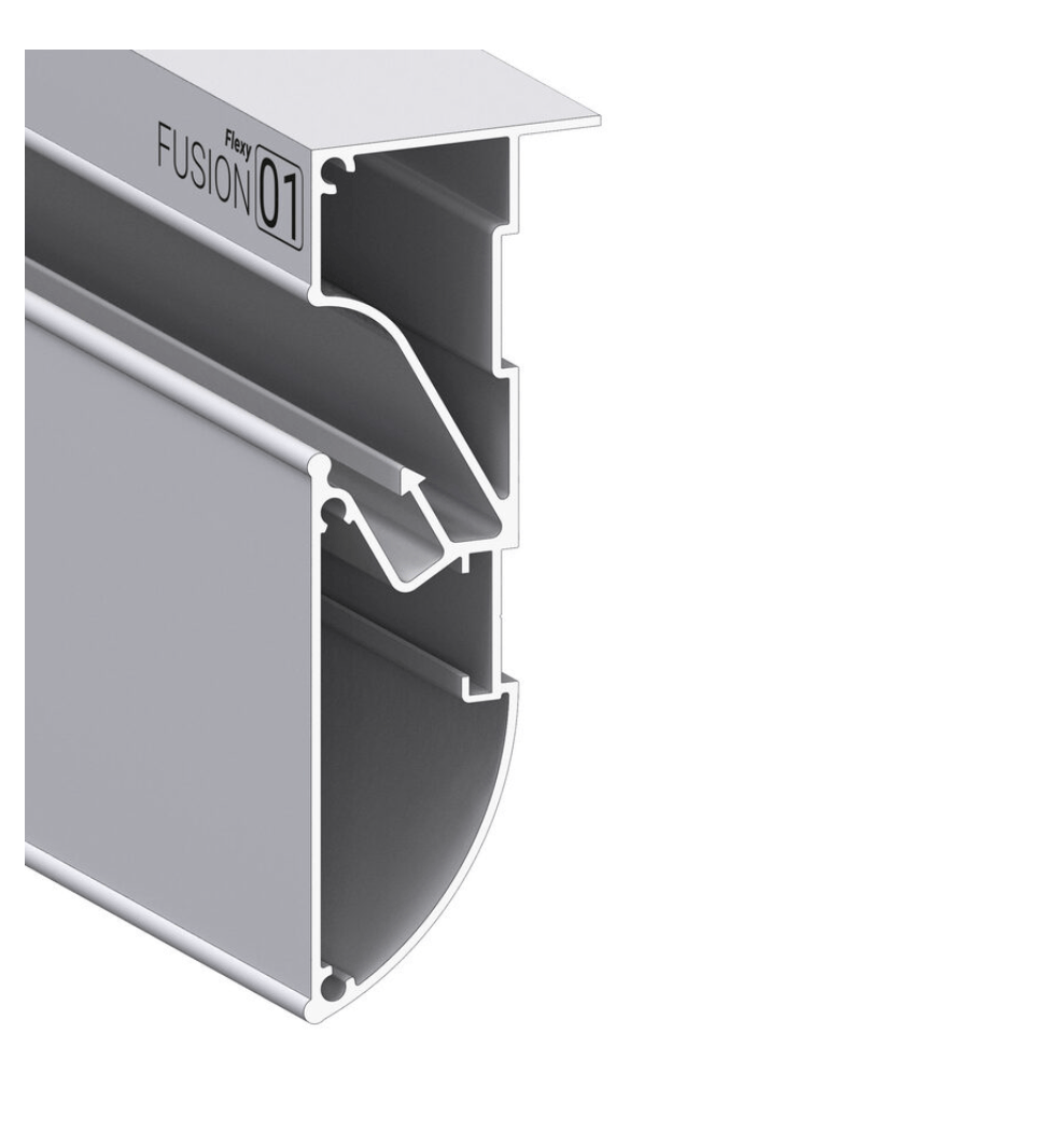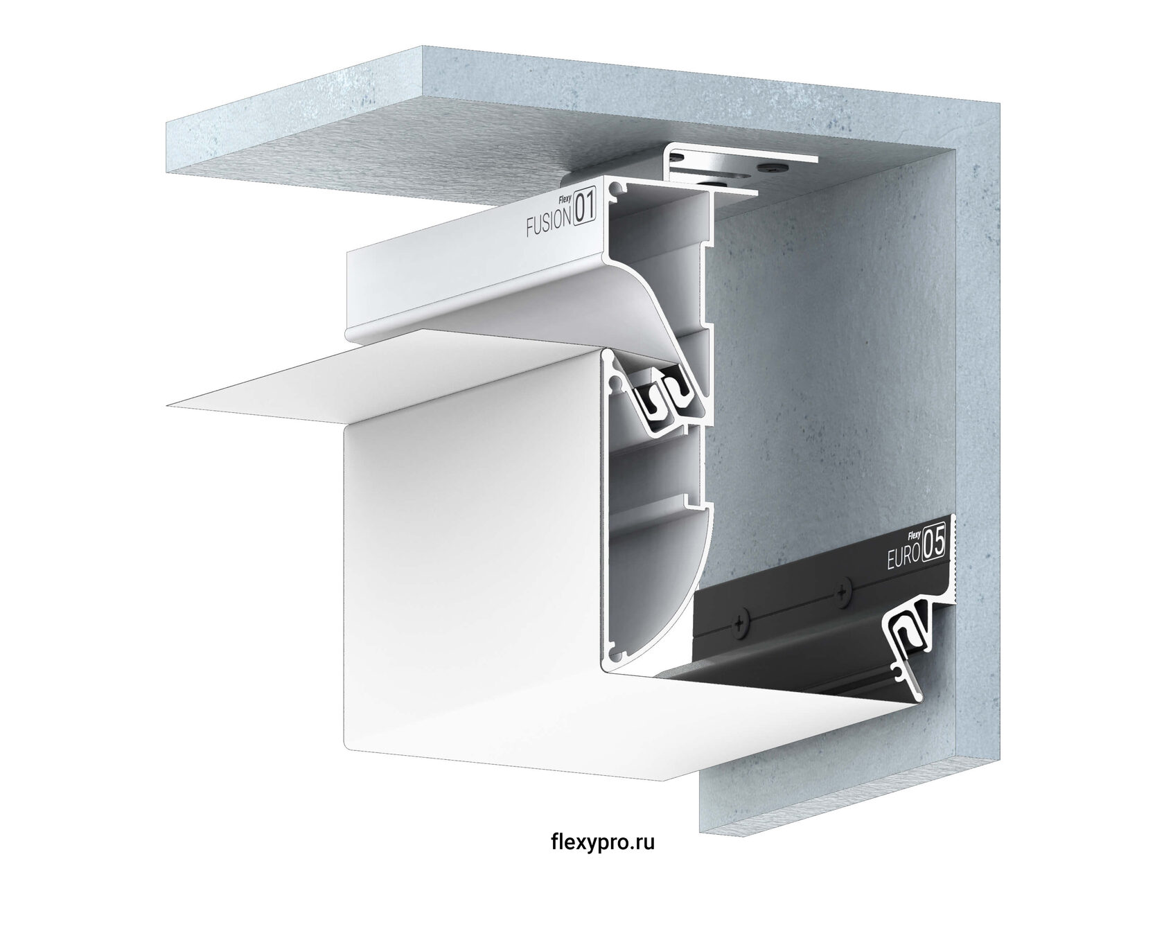 Профиль Flexy FUSION 01 для многоуровневых натяжных потолков с гарпунной системой крепления полотна. С бесщелевым примыканием полотен. Без подсветки.