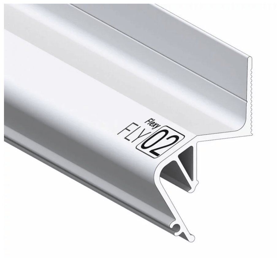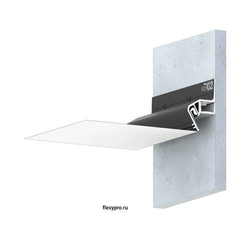 Некрашеный стеновой парящий профиль Flexy FLY 02 для натяжных потолков с гарпунной системой крепления полотна. С полкой для светодиодной ленты и креплением для светорассеивающей вставки.