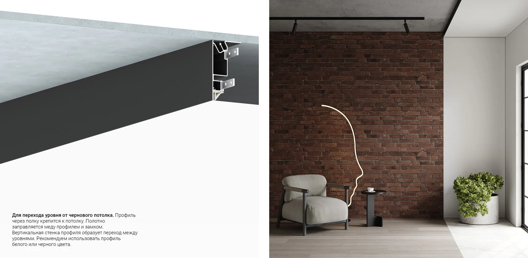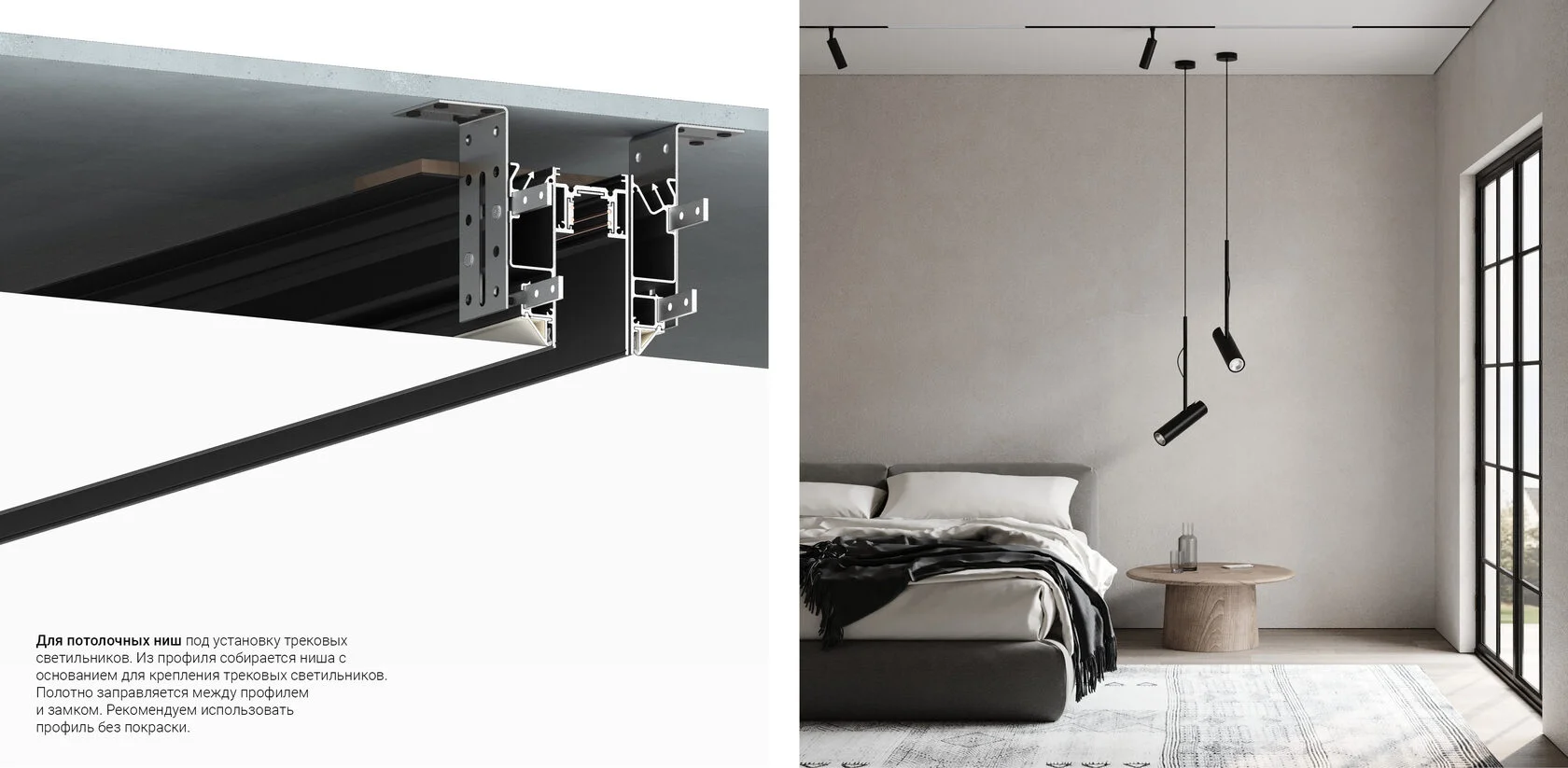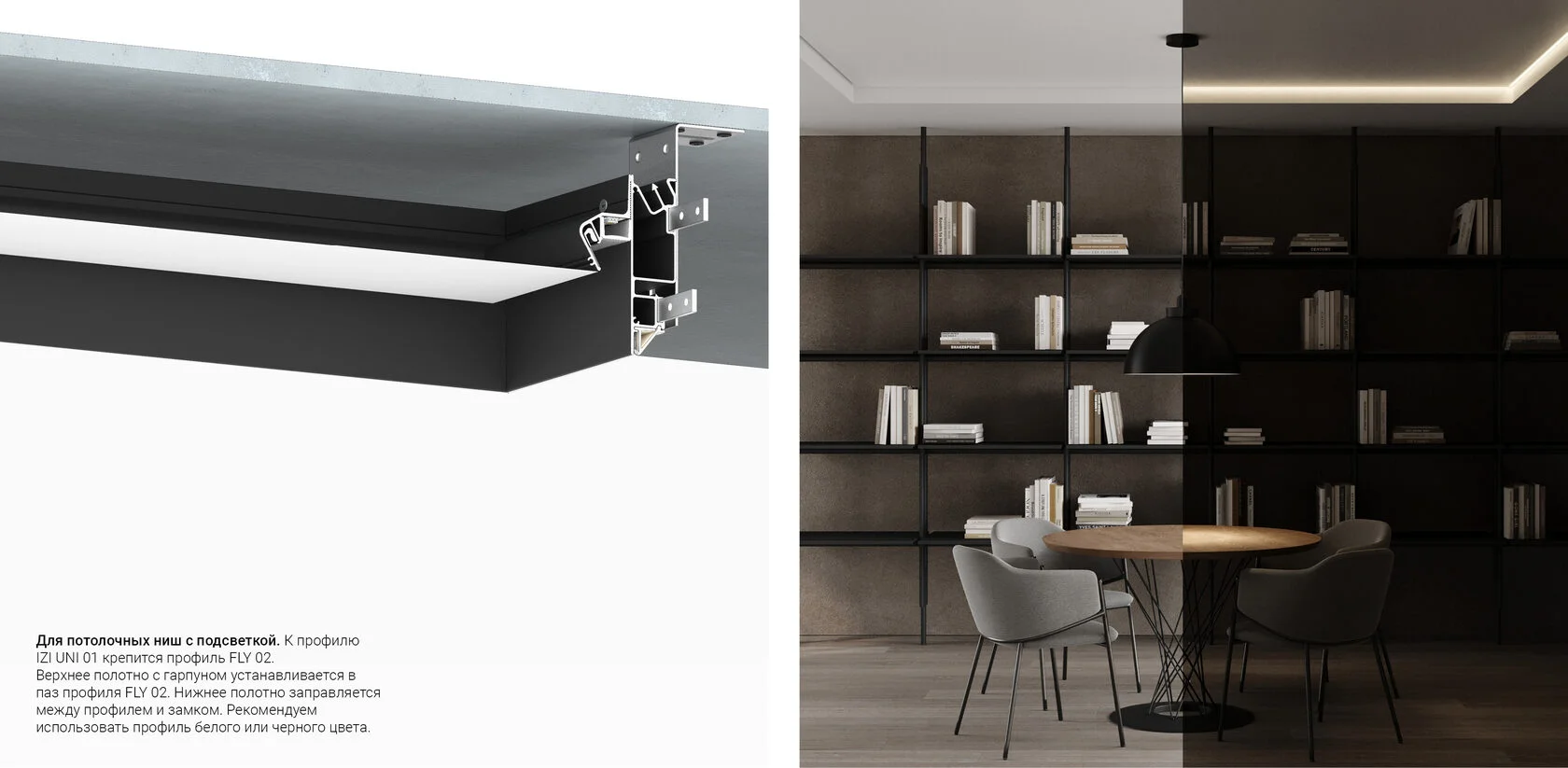 Профиль Flexy IZI UNI 01 для изготовления потолочных ниш и светильников. Профиль окрашен в белый муар.