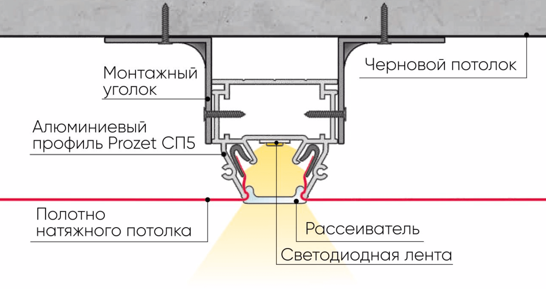 - Минимальный опуск потолка при установке профиля составляет 5 см.