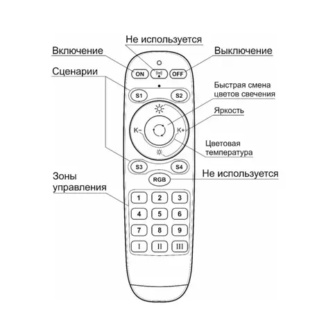 Пульт позволяет диммировать (изменять яркость) и регулировать цветовую температуру в диапазоне 2400-6000К. Функционалом кнопок можно создать, сохранить в память 5 сценариев и назначить до 10 зон освещения.