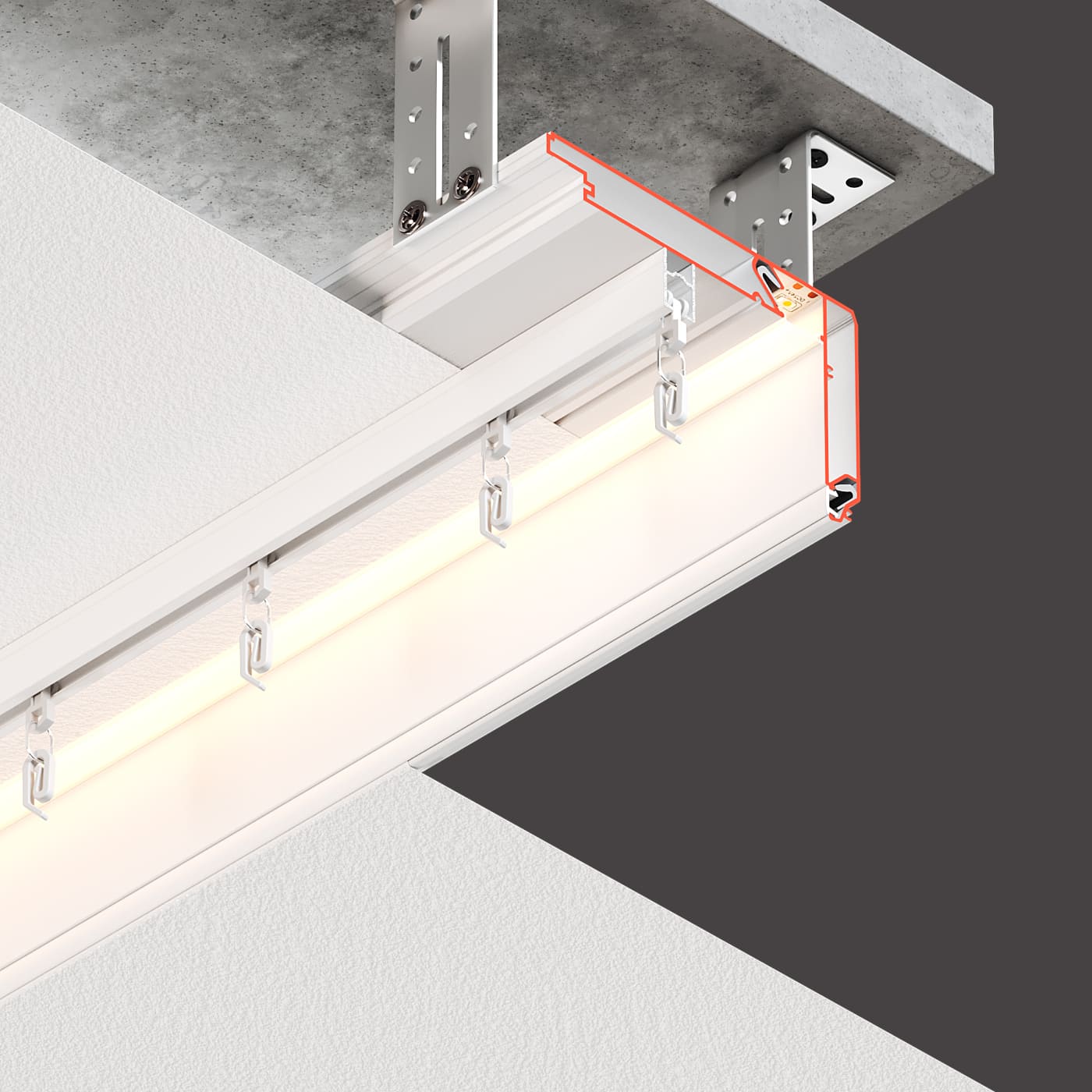 Профиль Flexy STANDART02 80 LED для изготовления прямых и угловых ниш для штор с подсветкой с последующей установкой накладных карнизов. Для гарпунной системы крепления полотна.