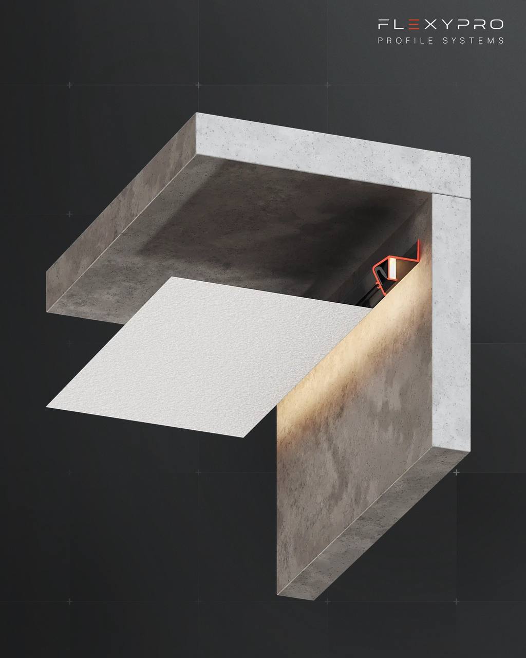 Стеновой парящий профиль для натяжных потолков с гарпунной системой крепления полотна. С пазом для светодиодной ленты и креплением для экрана.