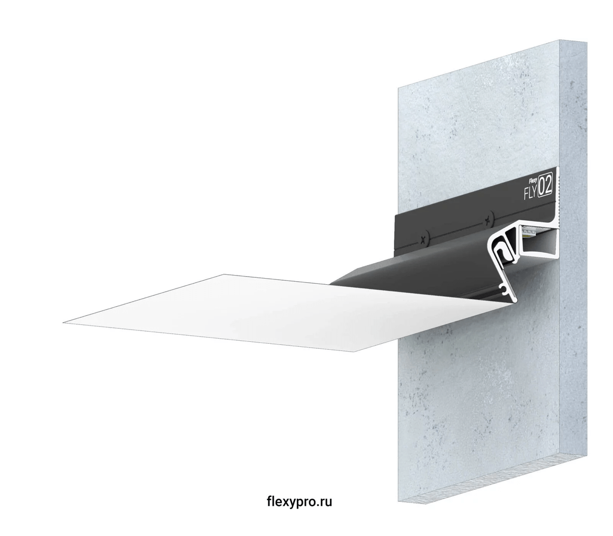 Окрашенный ЧЕРНЫЙ стеновой парящий профиль Flexy FLY 02 для натяжных потолков с гарпунной системой крепления полотна. С полкой для светодиодной ленты и креплением для светорассеивающей вставки.