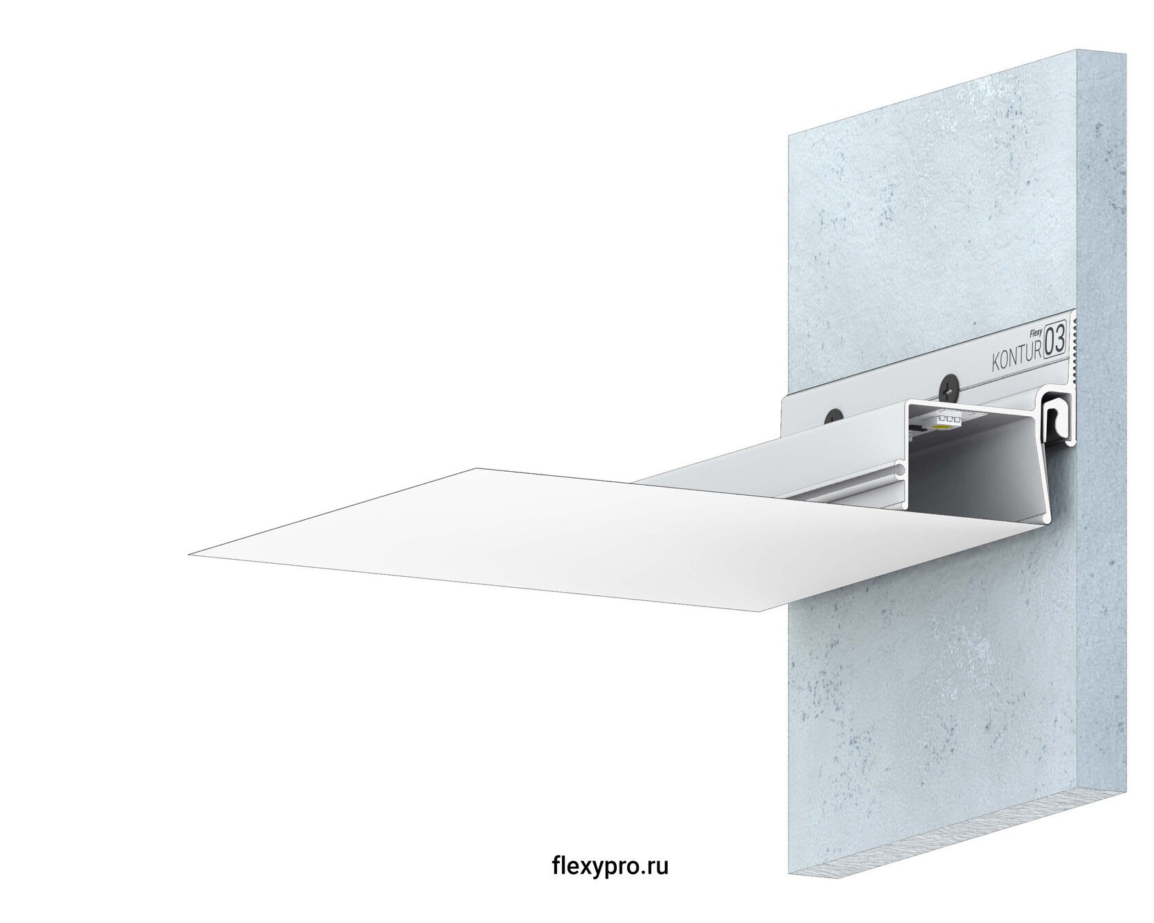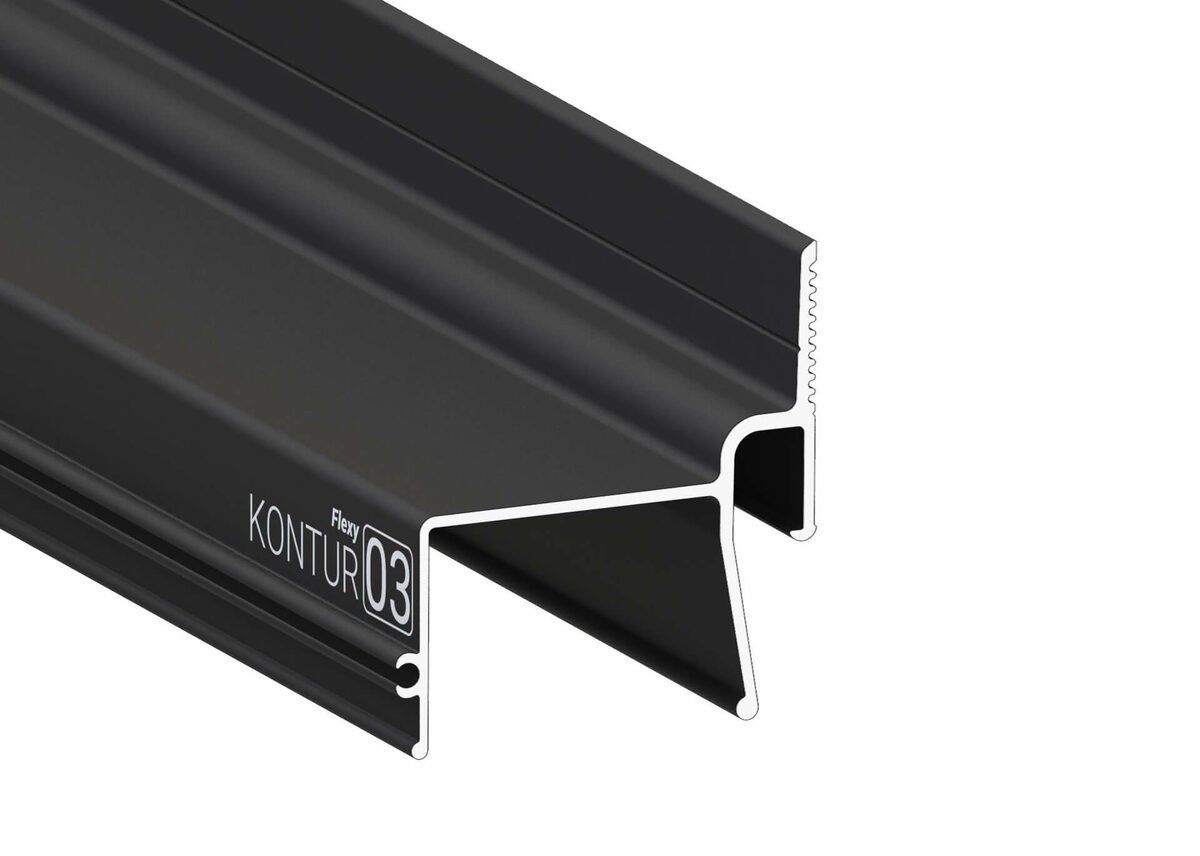 Стеновой контурный профиль Flexy KONTUR 03 для натяжных потолков с гарпунной системой крепления полотна. С полкой для светодиодной ленты для подсветки через полотно, направленной вниз. С теневым зазором.
