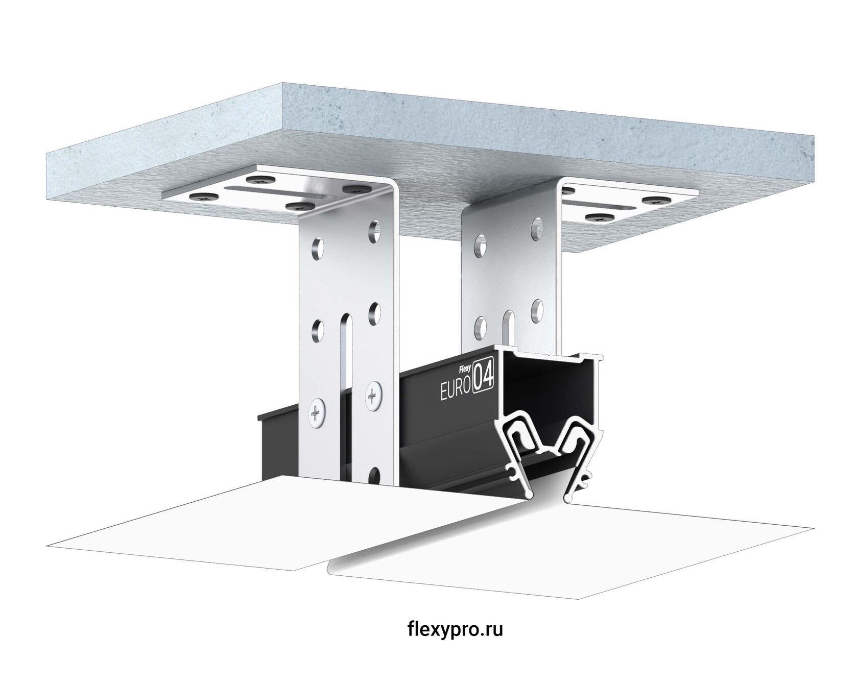Разделительный профиль Flexy EURO 04 с теневым зазором для натяжных потолков с гарпунной системой крепления полотна. Используется для наклонных натяжных потолков на мансардах либо для разделения поверхности полотна на несколько сегментов без использования разделительной вставки.