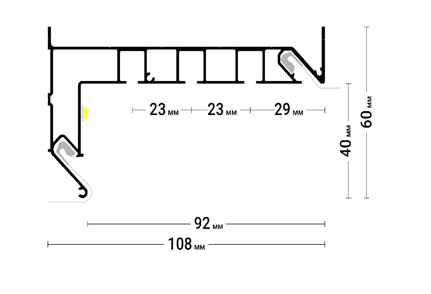 Конструктив Стыковочные пазы. Угловой паз под гарпун. Паз под бандаж. Полка под светодиодную ленту. Разметка для установки саморезов. Усиленный отбойник для жесткости.