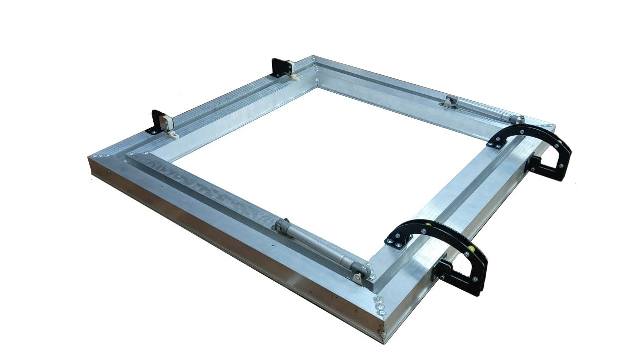 Люк устанавливается в уровень натяжного потолка. Конструкция изделия разработана из алюминиевого профиля, что позволяет использовать полотно на крышке люка создавая эффект единой поверхности. Для того, чтобы открыть смонтированный люк, нужно надавить рукой на дверцу и утопить ее приблизительно на 2-3 мм до щелчка и отпустить – дверца откроется.