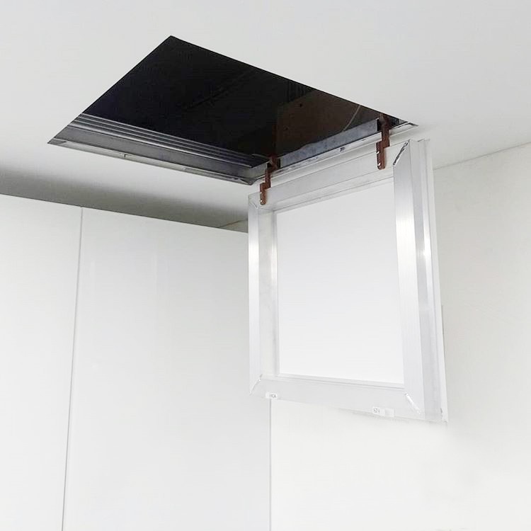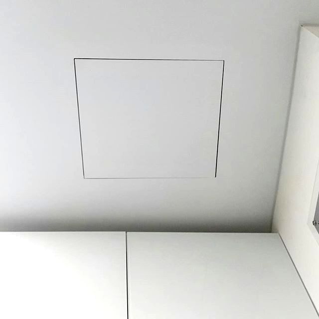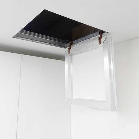 Люк для пленочных потолков с гарпунной системой крепления. Главное особенность люков - отсутствие видимых дополнительных элементов на натяжном потолке. Только небольшой зазор в 2 мм виден вокруг дверцы люка.