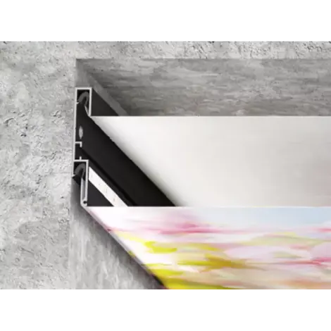 Double LumFer (двойной контурный) – специальный монолитный алюминиевый профиль, особенностью которого является возможность устанавливать 2 полотна на разных уровнях. Профиль применяется в арт потолках, резных и Double Vision, крепится по периметру помещения. Визуальная особенность этой конструкции заключается в образовании теневой зоны по периметру помещения шириной 0,6 см. Таким образом профиль обеспечивает идеально ровный темный контур без установки заглушки по периметру потолка.