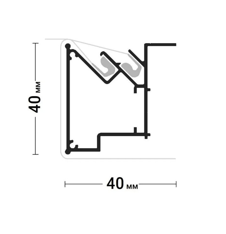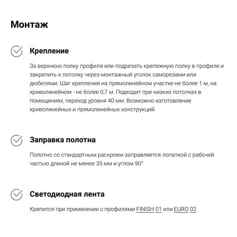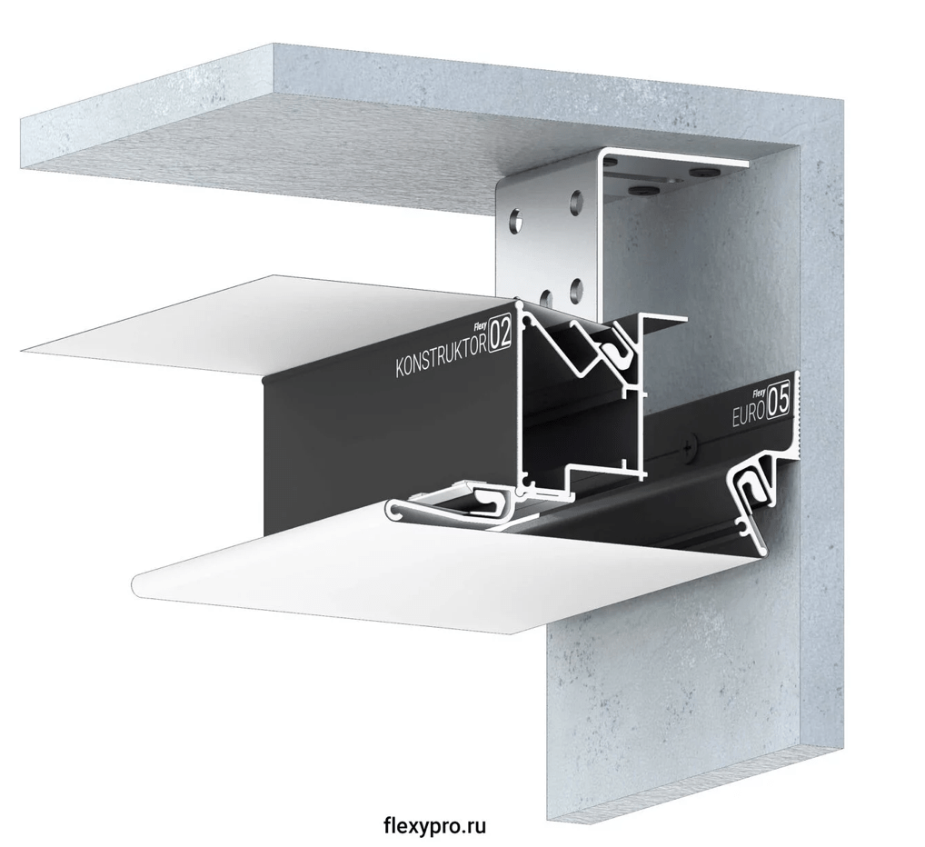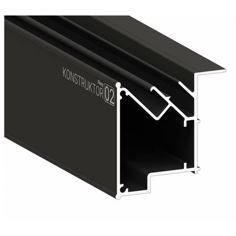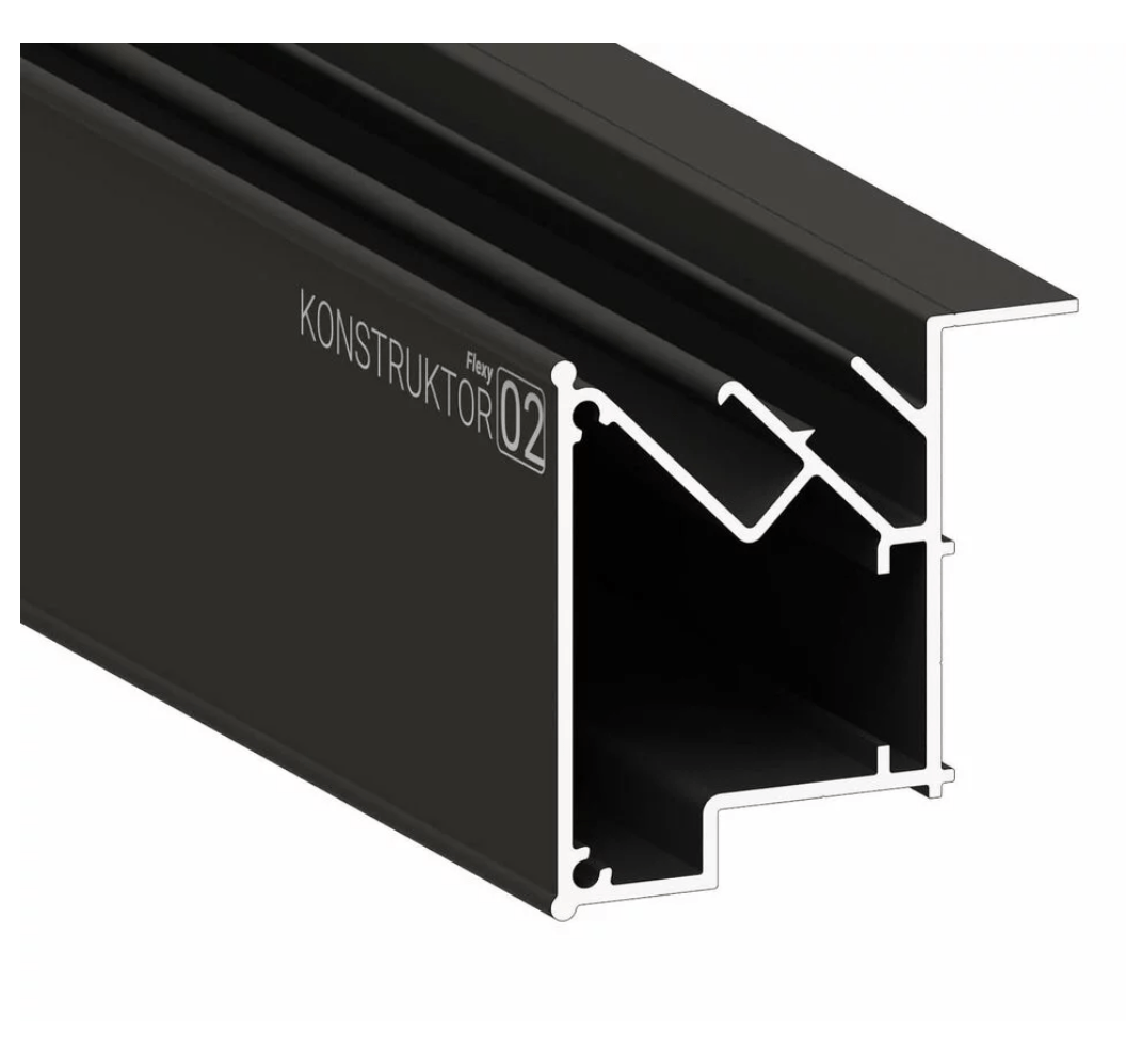 Профиль Flexy KONSTRUKTOR 02 цвета ЧЕРНЫЙ МУАР для многоуровневых натяжных потолков с гарпунной системой крепления полотна. Для изготовления ниш под установку накладных, точечных и линейный светильников. Применяется с профилями FINISH 01 или EURO 02.