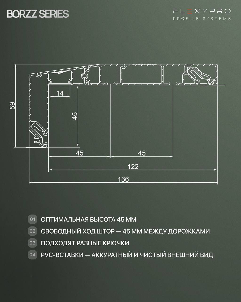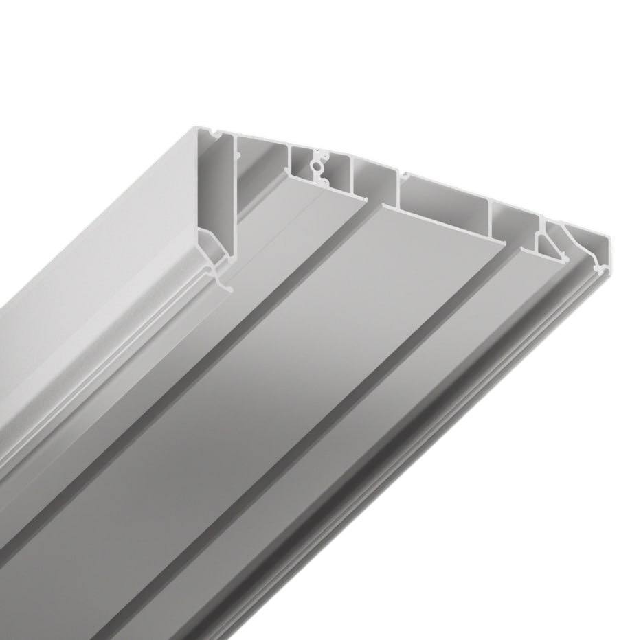 Профиль для изготовления скрытых карнизных ниш с двумя пазами под установку штор и тюля. Увеличенная глубина и расстояние между камерами 45 мм обеспечивают плавный и бесшумный ход бегунков. Пазы под гарпун закрываются PVC-вставкой.