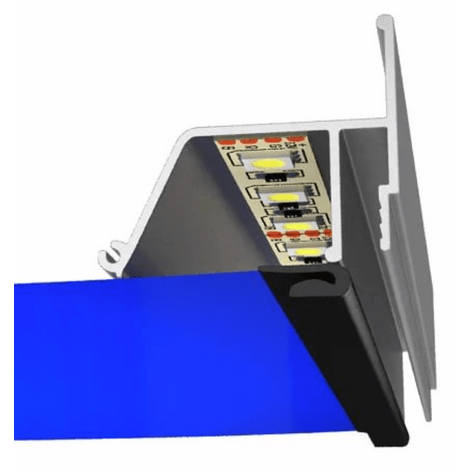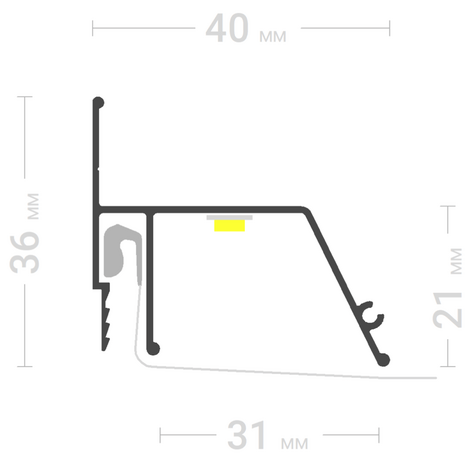 Профиль ПФ 5642 Контурный предназначен для монтажа натяжных потолков с гарпунной системой крепления полотна, с полкой для светодиодной ленты, направленной вниз, и возможностью закрытия профиля стеновой вставкой.