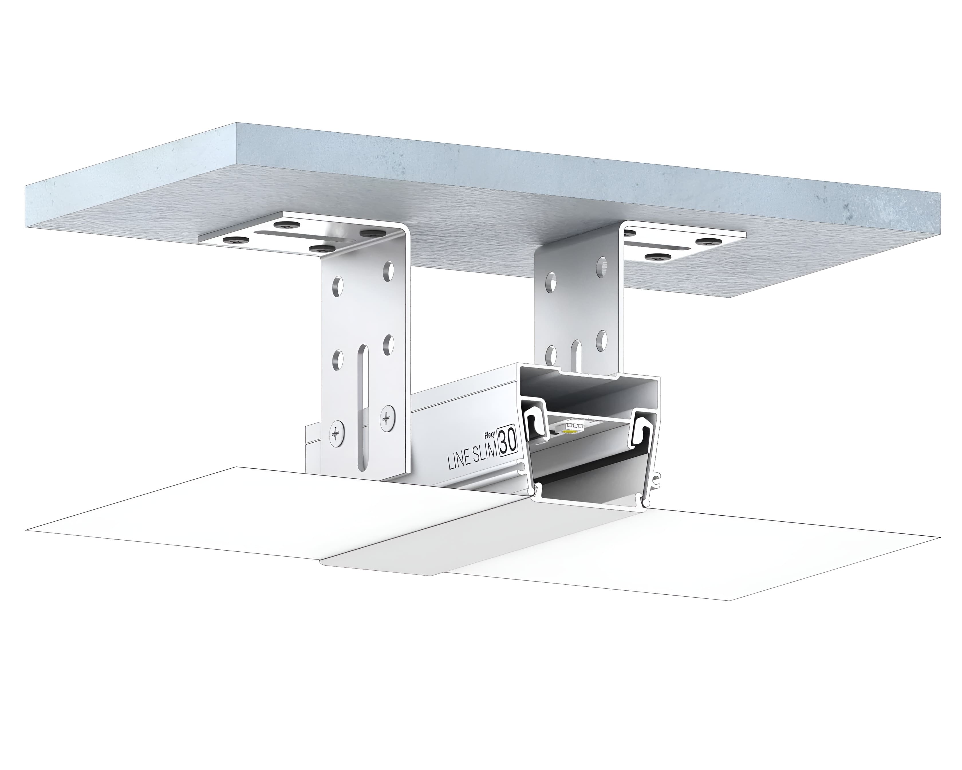 LINE SLIM 30 с уменьшенной высотой специально разработан для интеграции светодиодных лент, что позволяет формировать ровные и яркие световые линии на потолке. Это решение идеально подходит для современных интерьеров, где свет играет важную роль в дизайне. Может использоваться как для прямых, так и для криволинейных участков, что дает возможность создавать световые линии любой формы и конфигурации. Профиль обеспечивает не только декоративную функцию, но и эффективное освещение пространства, создавая равномерный световой поток без теней и бликов. Профиль легко монтируется с использованием стандартных крепежных элементов и инструментов, что снижает затраты времени и труда на установку. Закрывается светорассеивающей вставкой или экраном белого или черного цвета. Легкий доступ для замены ленты без съема полотна.