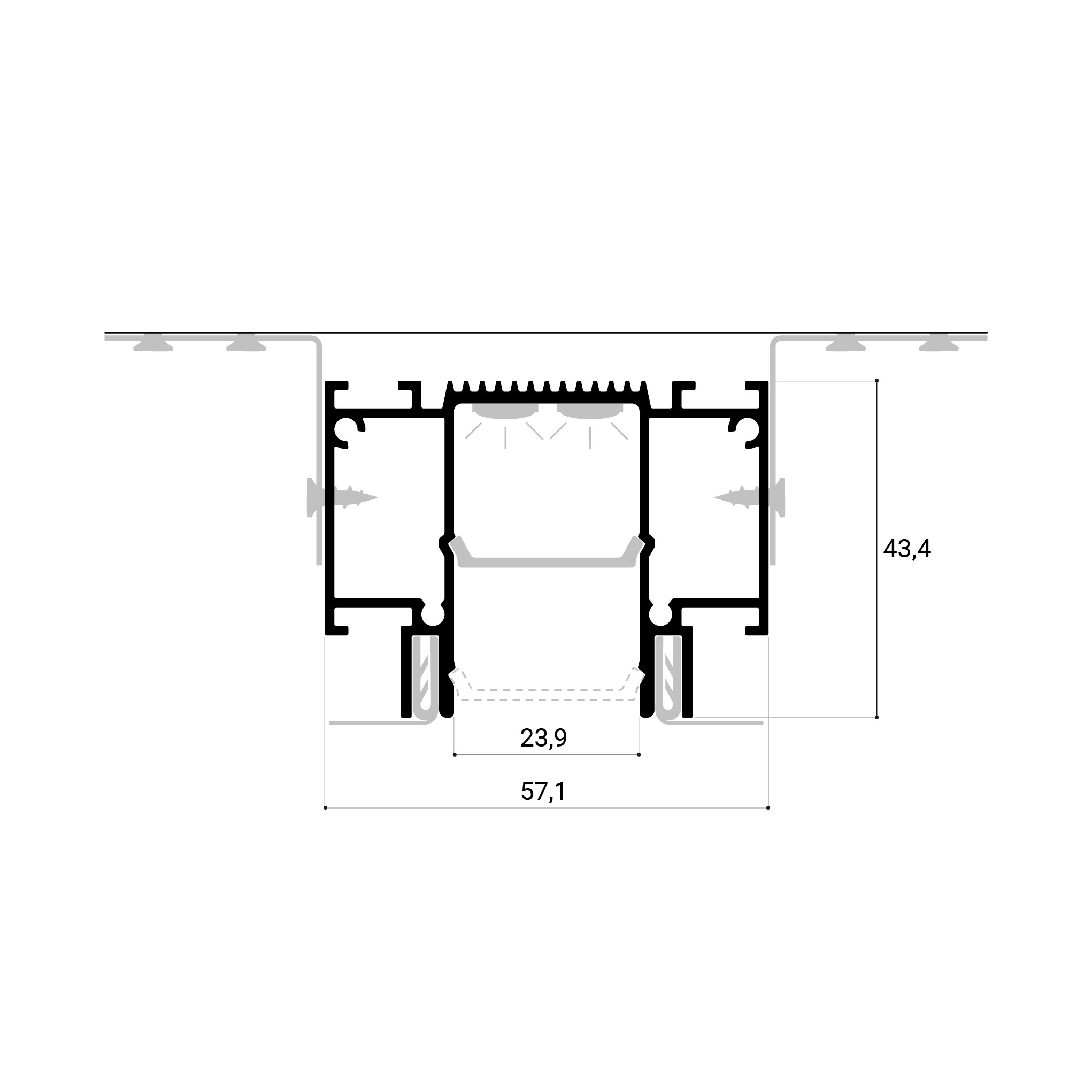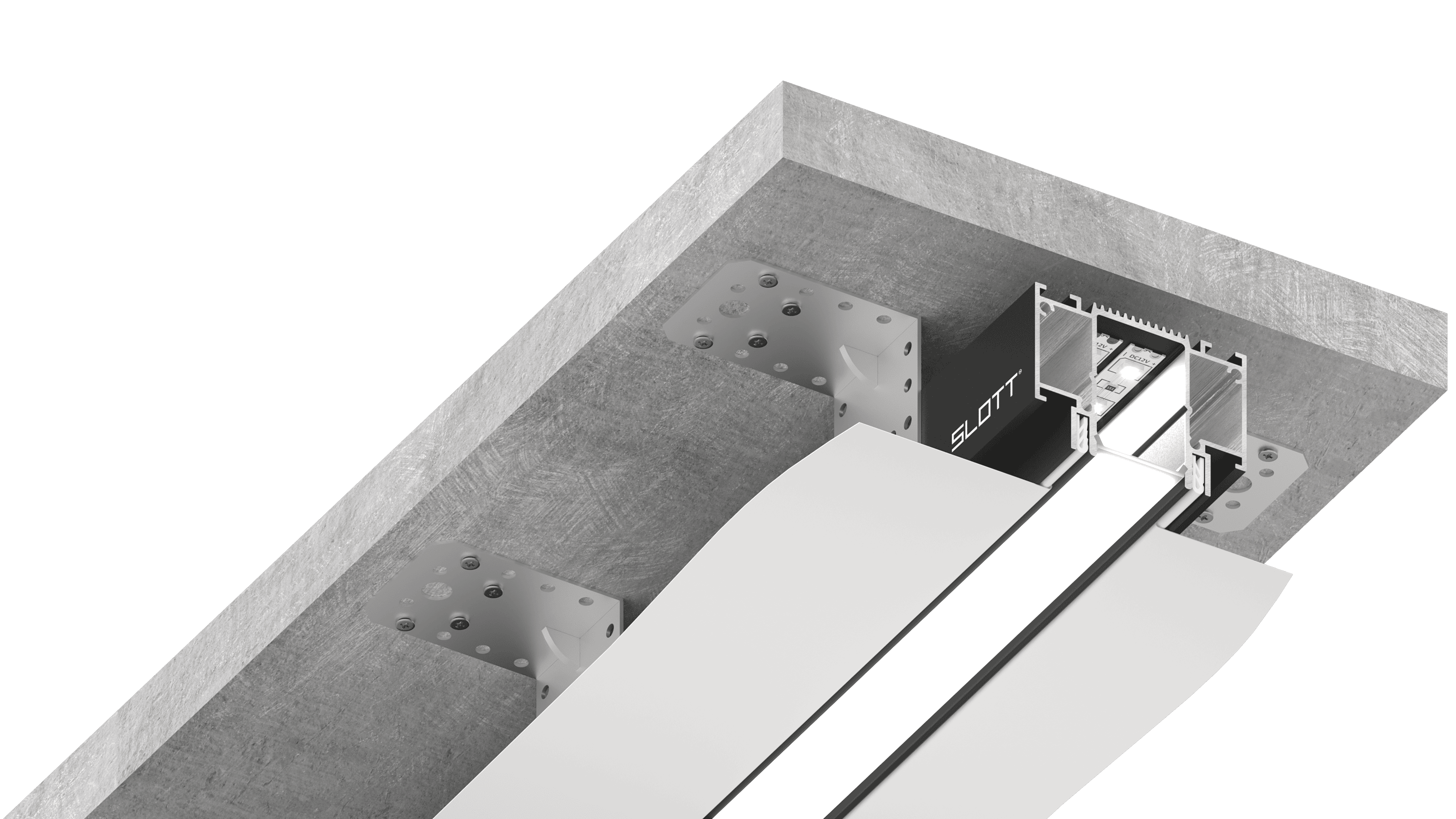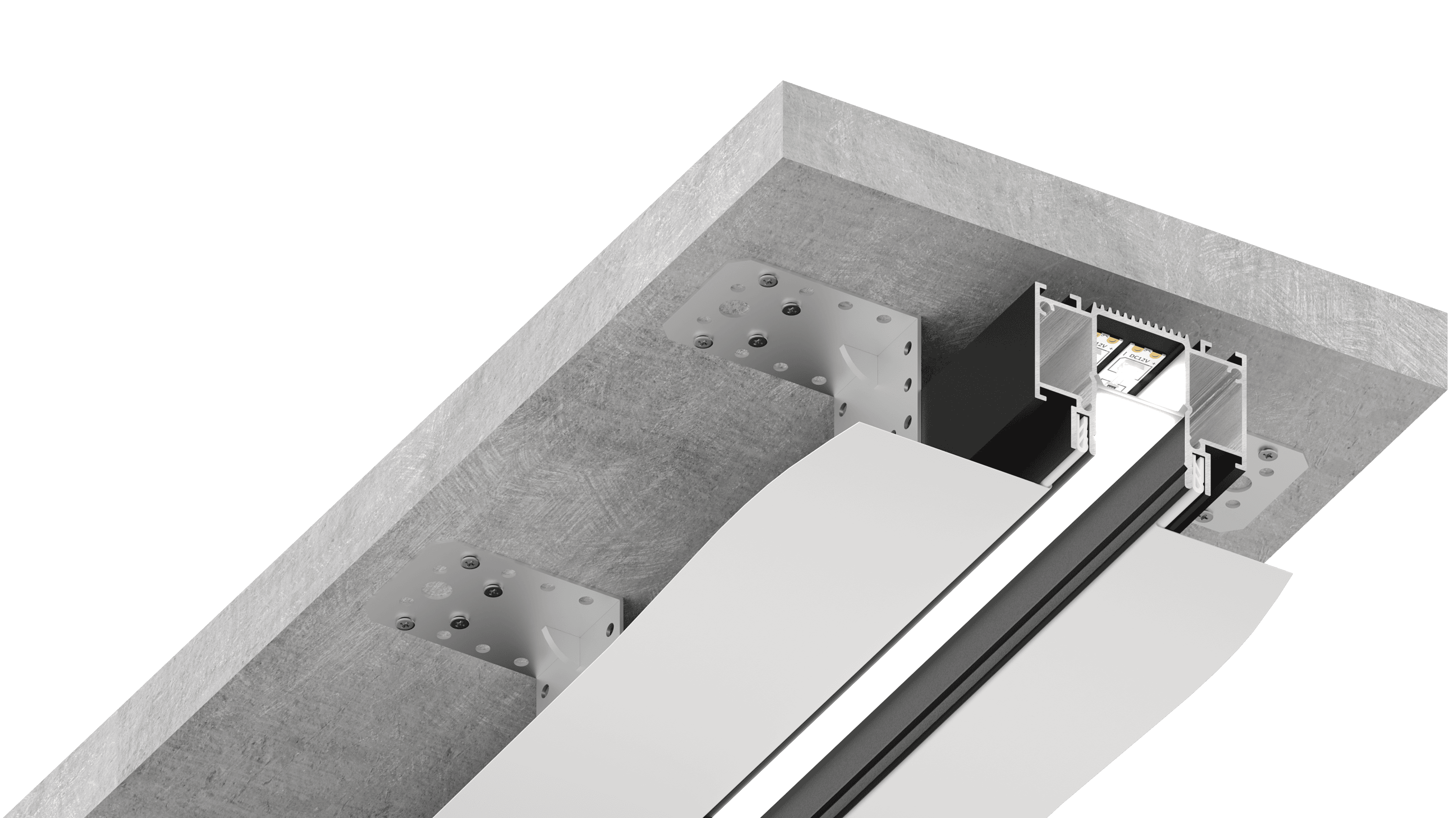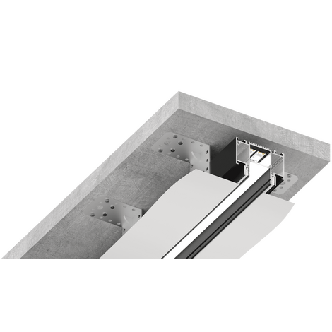 Главная особенность данного решения — демпферная система крепления, которая обеспечивает бесщелевое примыкание. Подходит как для ПВХ, так и для ткани. Дополнительными элементами решения являются торцевые заглушки и система стыковки в четырех точках (для углового и прямого соединения).
