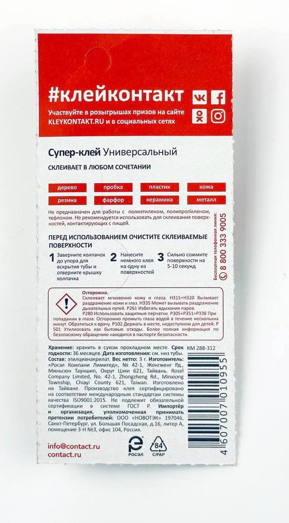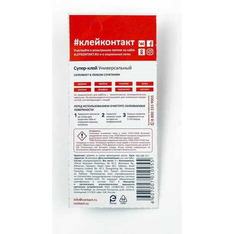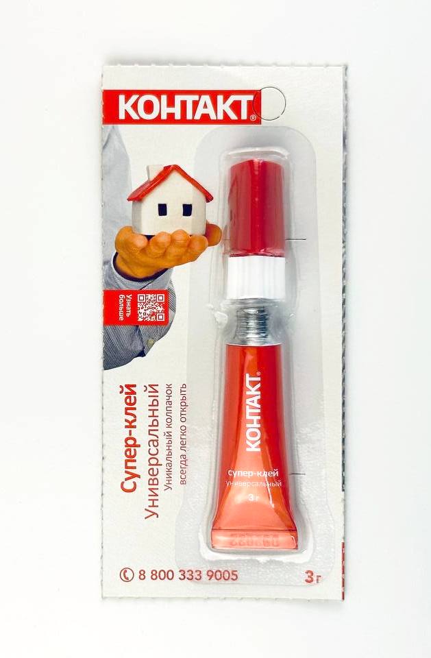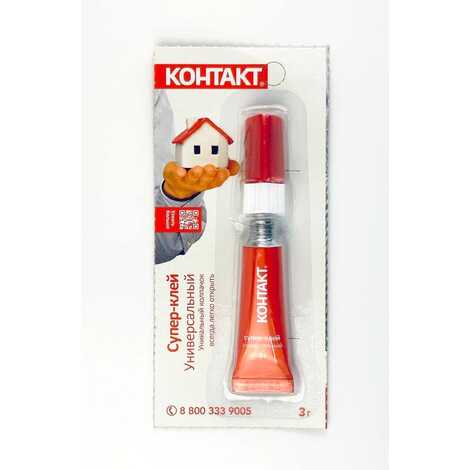 Универсальный супер-клей Контакт предназначен для моментального приклеивания различных материалов (фарфор, керамика, дерево, кожа, резина, металл, пробка, картон и большинство пластиков).