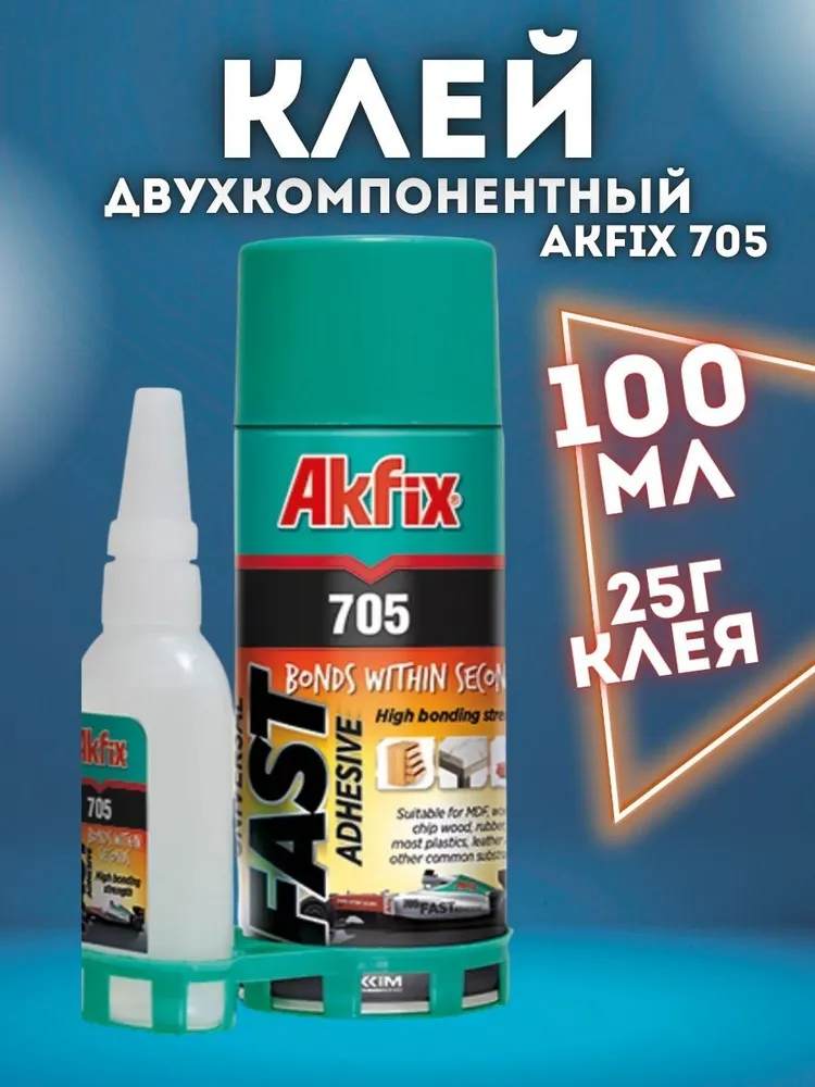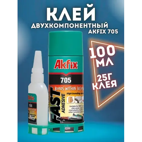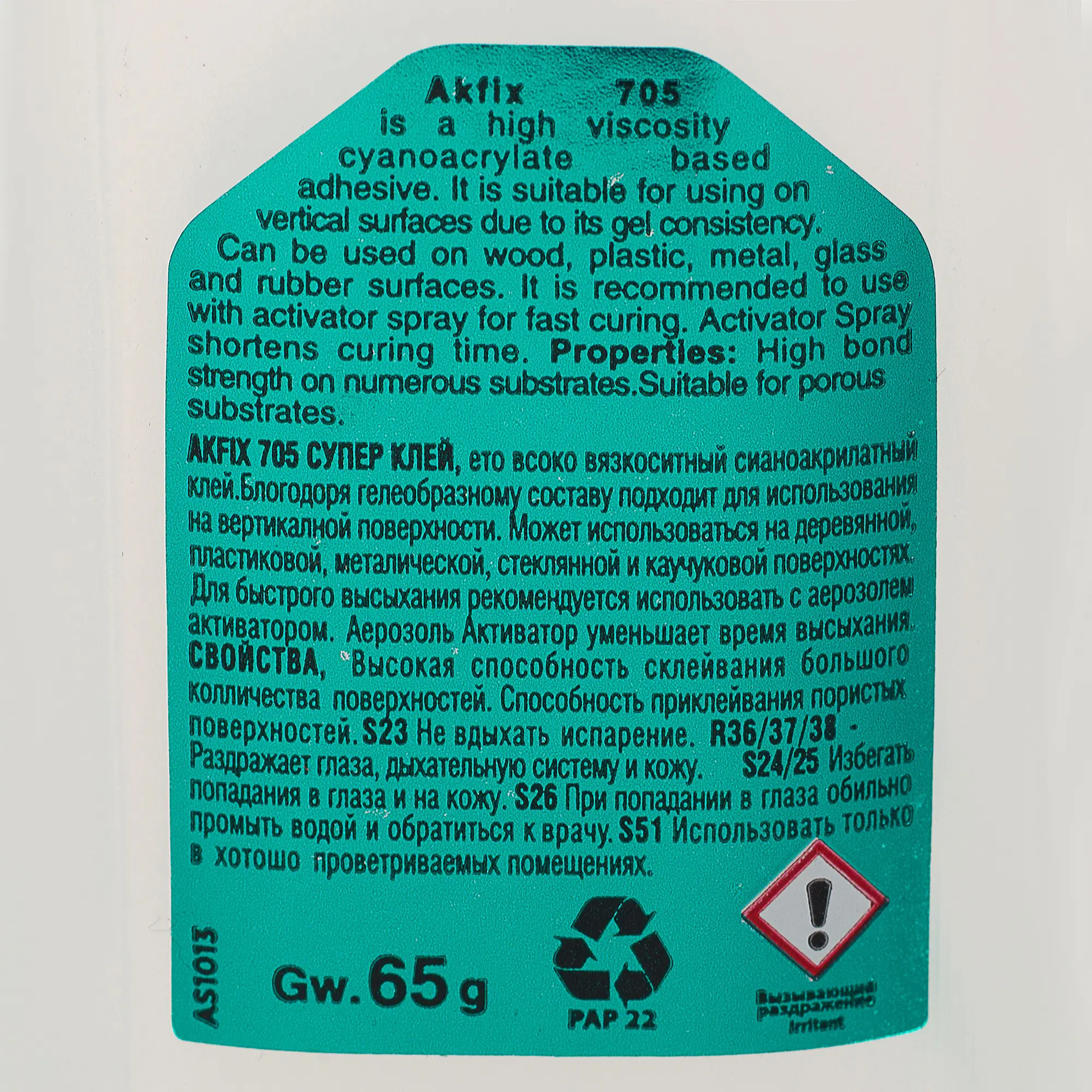 Суперклей Akfix 705 (Турция) — двухкомпонентный прозрачный состав. Цианоакрилатный вязкий гель (клеящая основа) весом 65 г упакован в пластиковую емкость. Активатор (ускоряет высыхание) поставляется в формате аэрозоля в баллоне емкостью 200 мл. Продукт предназначен для склеивания древесины, пластика, бумаги, кожи и других материалов с шероховатой или пористой поверхностью.