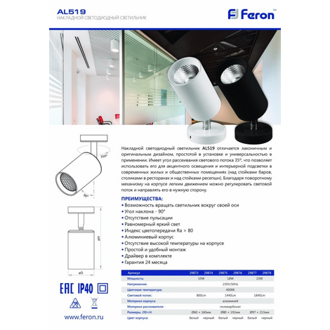 Светильник светодиодный 18W, 1440Lm, 35 градусов, белый, наклонный, AL519